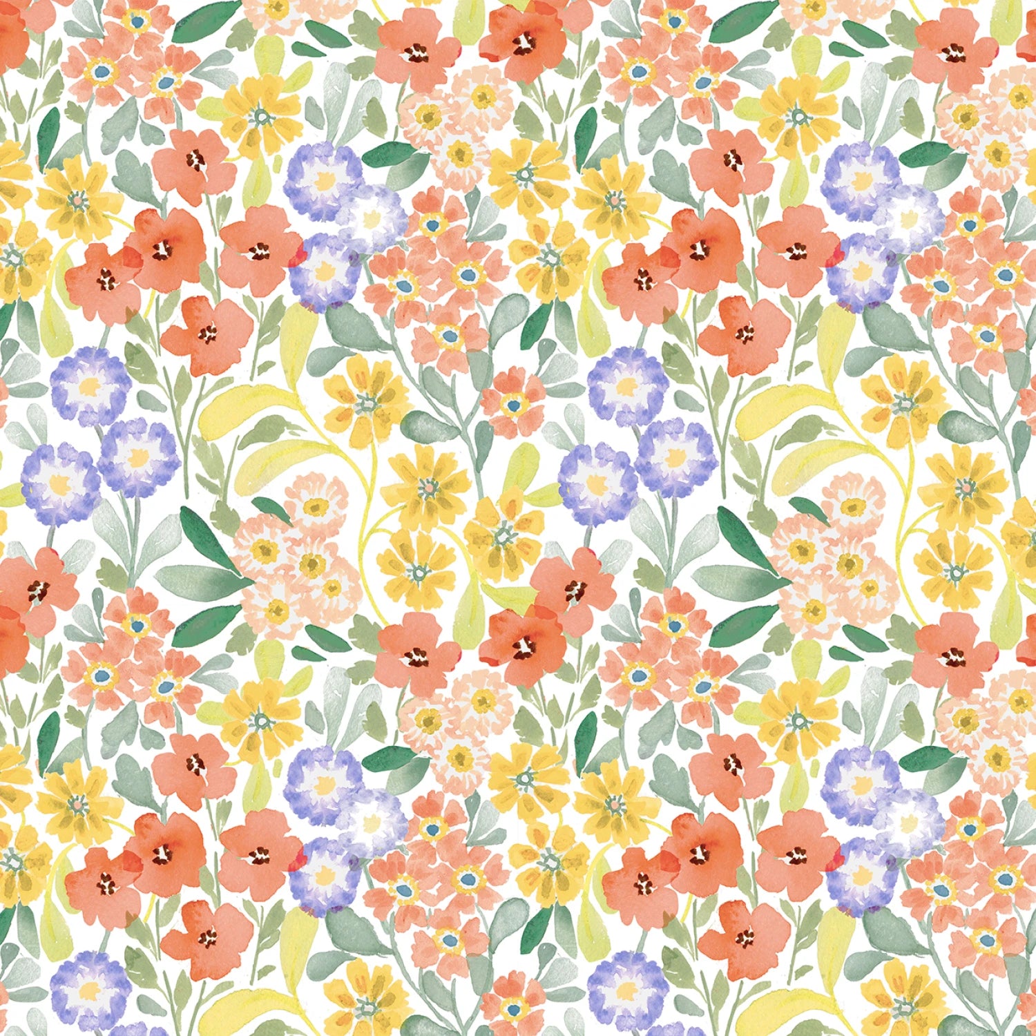 This fabric features floral designs of red, yellow, and purple flowers with green leaves on a crisp white background.