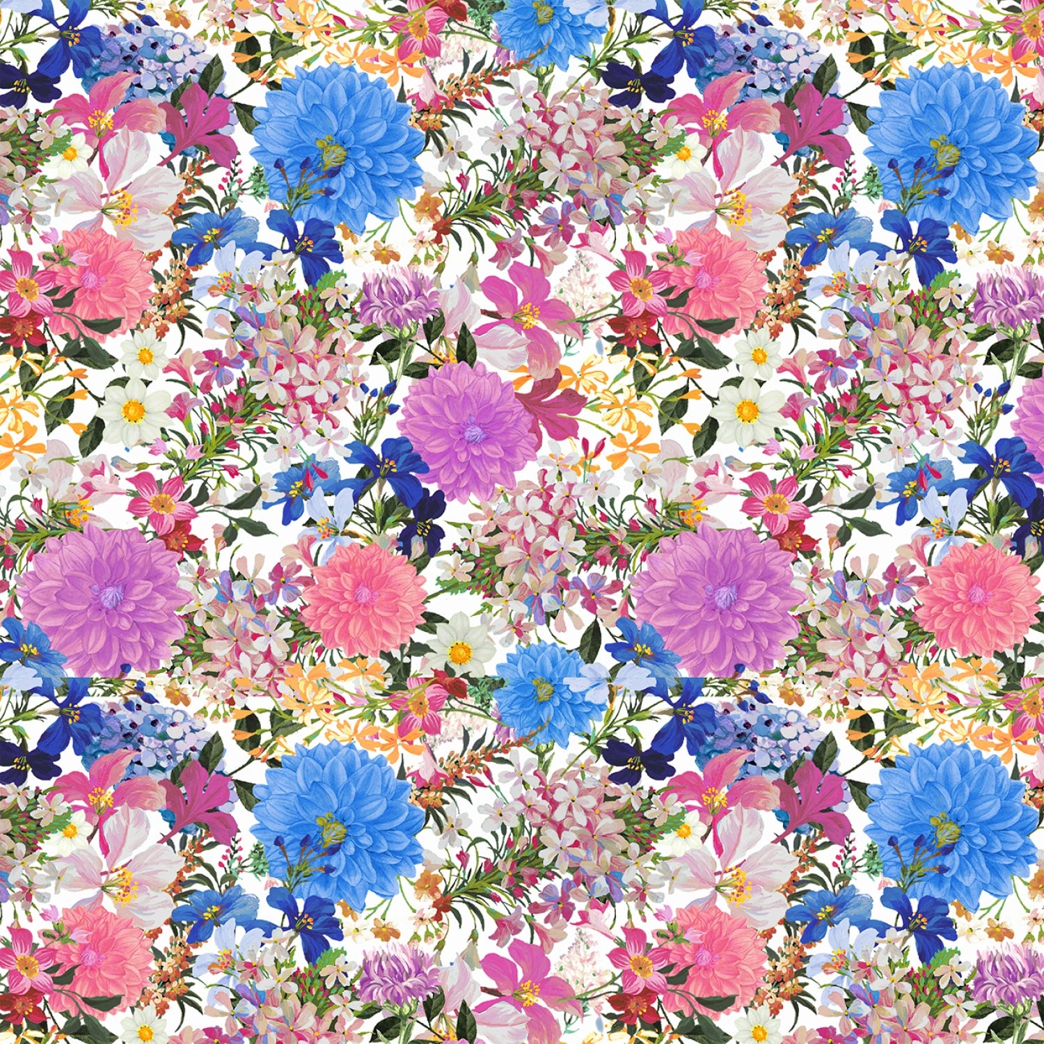 This floral print fabric features wildflowers in shades of electric blue, soft pink, lavender, orange and white scattered across a white background.