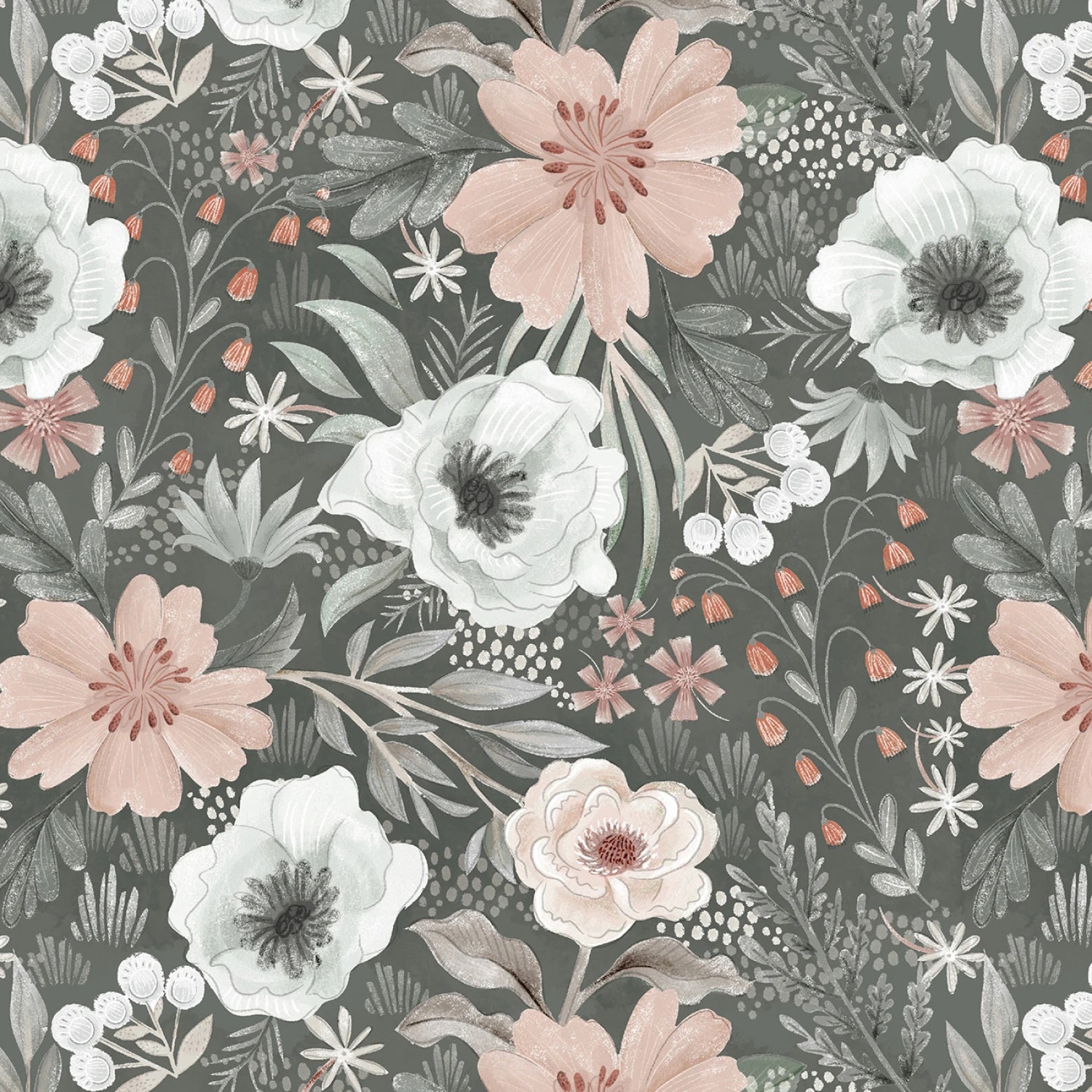 This fabric showcases a floral pattern with large, detailed flowers in shades of pink, white, and soft green, set against a muted gray-green background. Design repeats every 8 inches.
