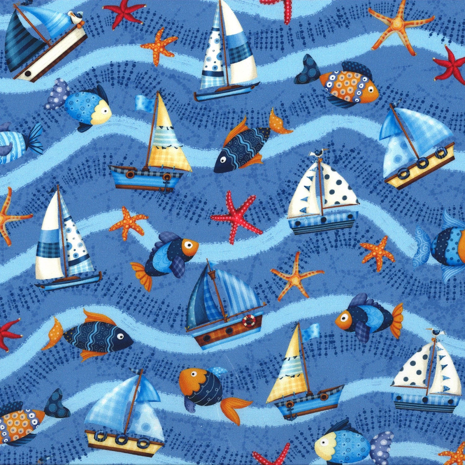 This fabric features a nautical theme with a blue background with various sailboats, fish, and starfish. The design showcases a playful, wavy pattern that brings the ocean to life, with sailboats in different sizes and colors, fish swimming in various directions, and starfish swimming in all directions.