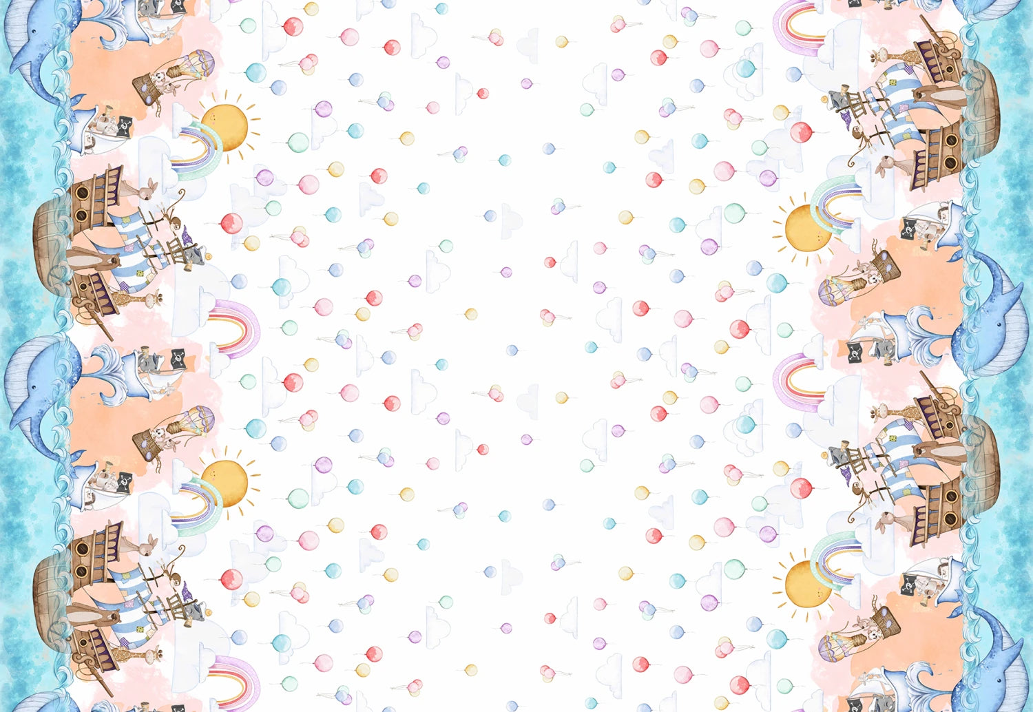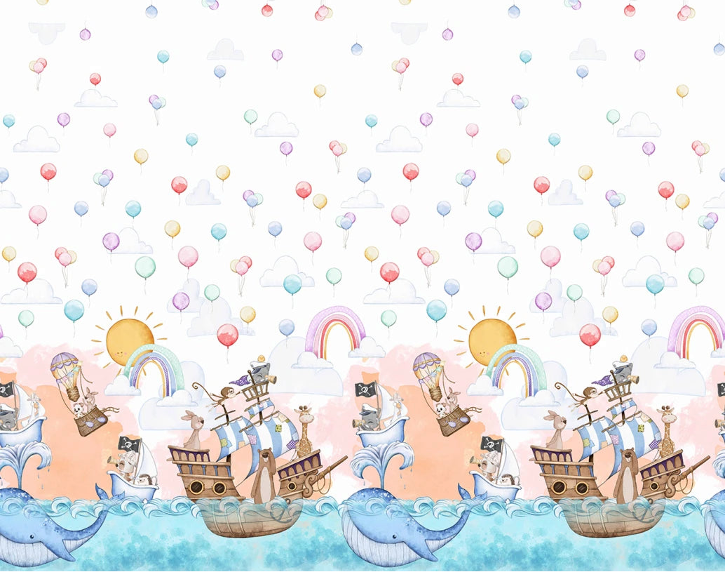 A double border print featuring sea-themed motifs -- ships sailing under sunny skies, colorful balloons floating amidst rainbows, majestic whales gliding through azure waves, and fanciful castles perched on the horizon—all rendered in soft pastel hues of blue, orange, pink, and white against a crisp background. Fifteen-inch repeat.