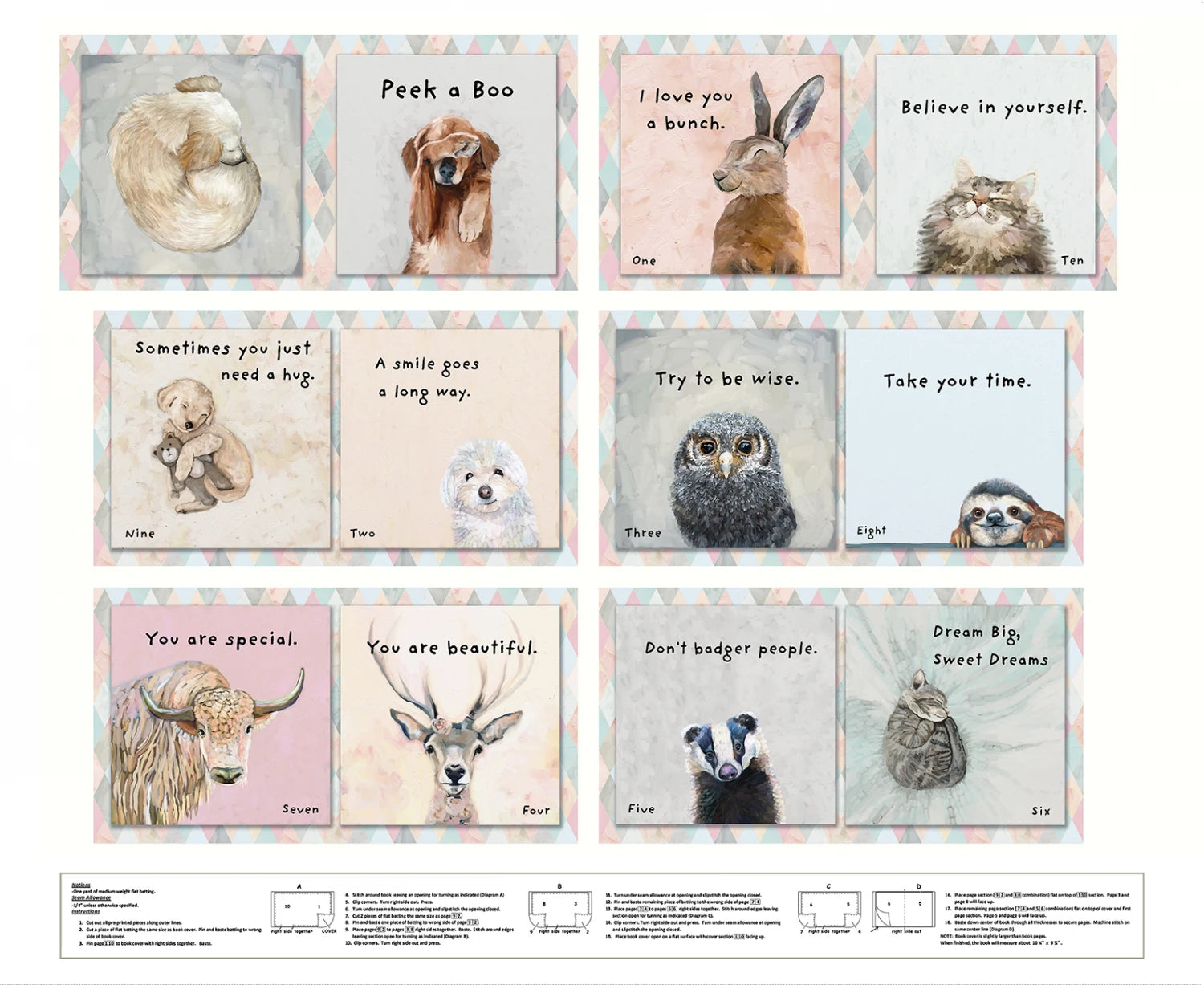 This fabric panel features a collection of positive affirmations paired with charming illustrations of various animals. Each block of the panel is dedicated to a different message, such as "Peek a Boo" with a sleeping puppy, "I love you a bunch" with a rabbit, and "Believe in yourself" with a cat.