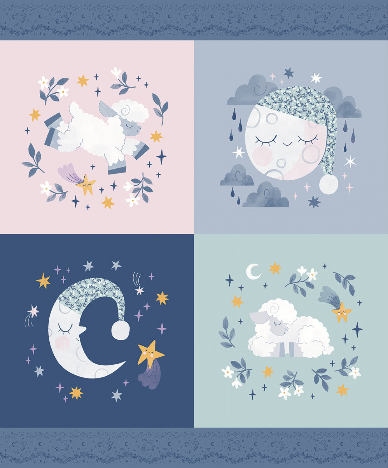 This pillow panel features a celestial theme with illustrations of a whimsical sheep and a serene moon, both adorned with nightcaps and surrounded by stars and floral motifs. The design is divided into four blocks, each showcasing different elements of the night sky all in soft pastel colors.