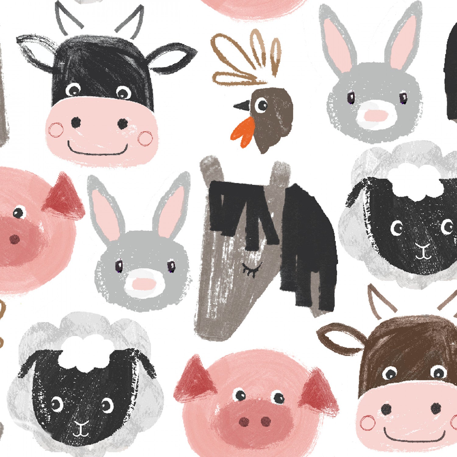 This flannel fabric features a delightful array of farm animal faces, including cows, pigs, sheep, rabbits, and a turkey, all illustrated in a playful and whimsical style. The design is set against a clean white background.
