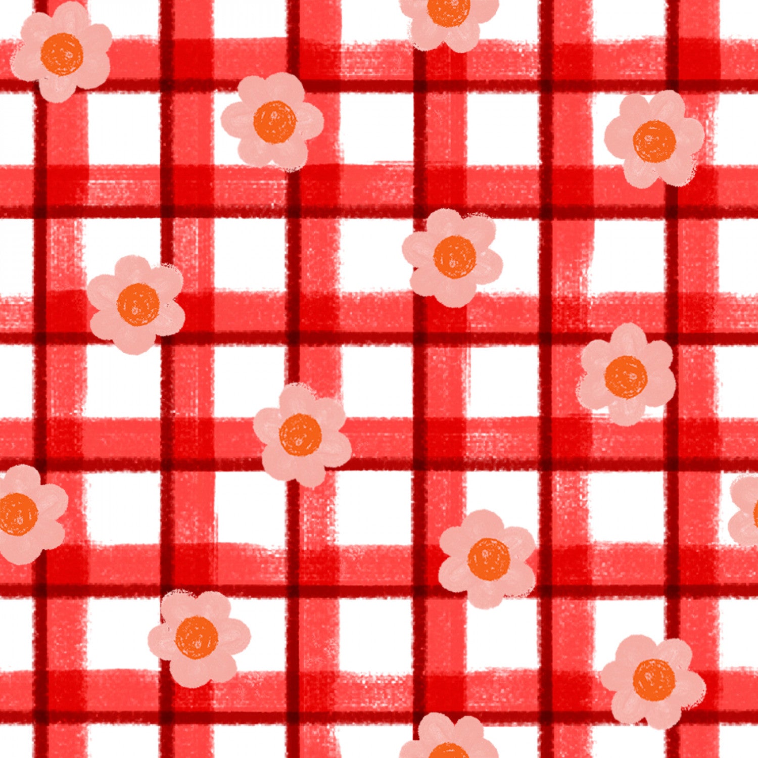 This flannel fabric features a design of red plaid intersected with delicate pink flowers,