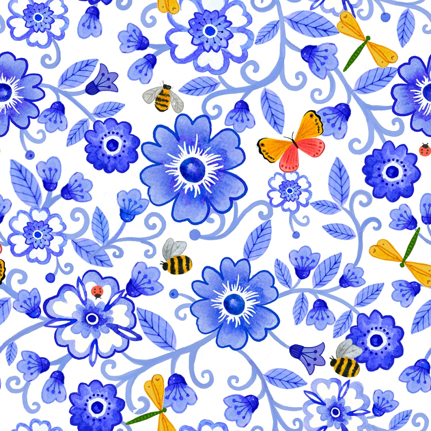 This fabric features a garden scene with an array of blue flowers intertwined with vines and accented with bees, butterflies, dragonflies, and ladybugs, all rendered in a watercolor style on a white background.