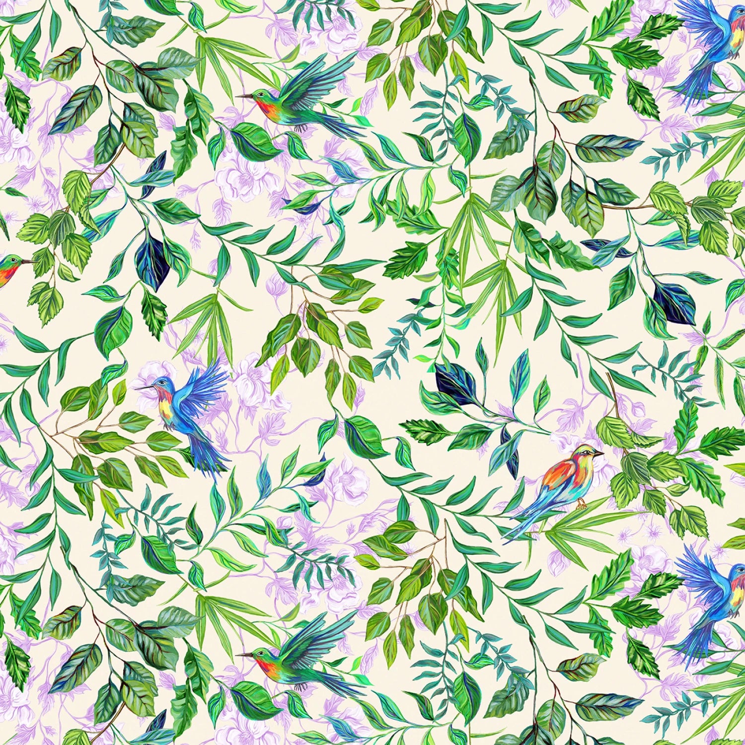 This fabric features a design of intertwining green leaves and purple flowers with colorful birds in flight.