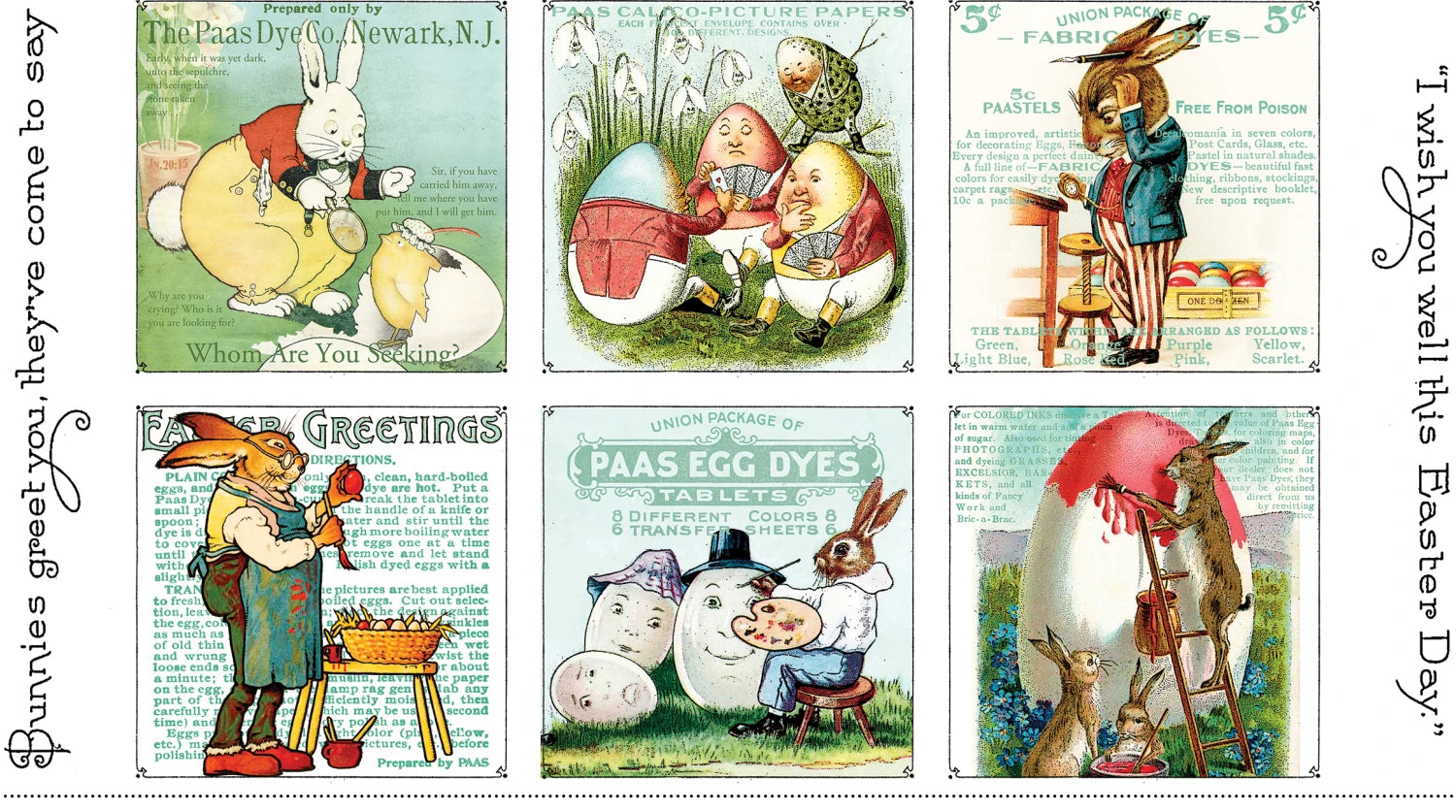 This fabric panel features illustrations of bunnies engaged in various Easter activities. Each panel showcases a unique scene, from bunnies painting eggs to whimsical greetings, all rendered in a vintage-inspired style with soft pastel colors.
