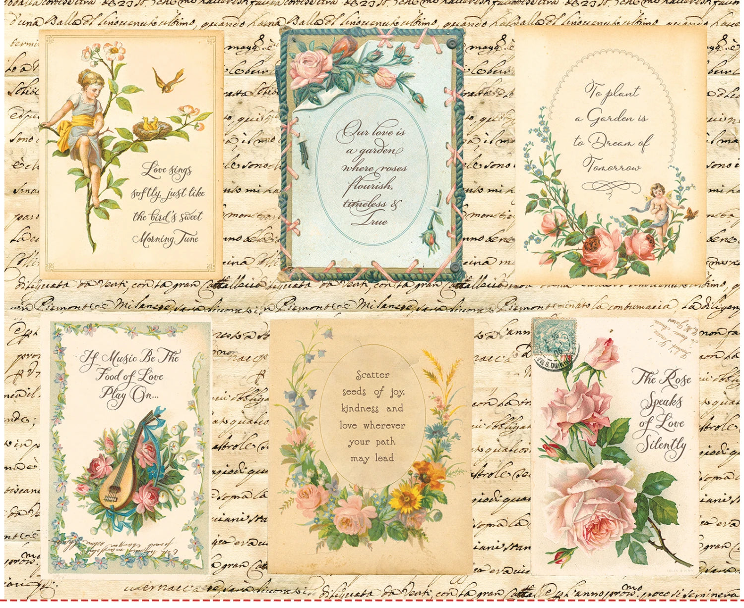 This fabric panel features ten beautifully designed blocks, each adorned with romantic floral illustrations and heartfelt quotes. The designs evoke a vintage garden theme, with delicate roses, butterflies, and charming script.