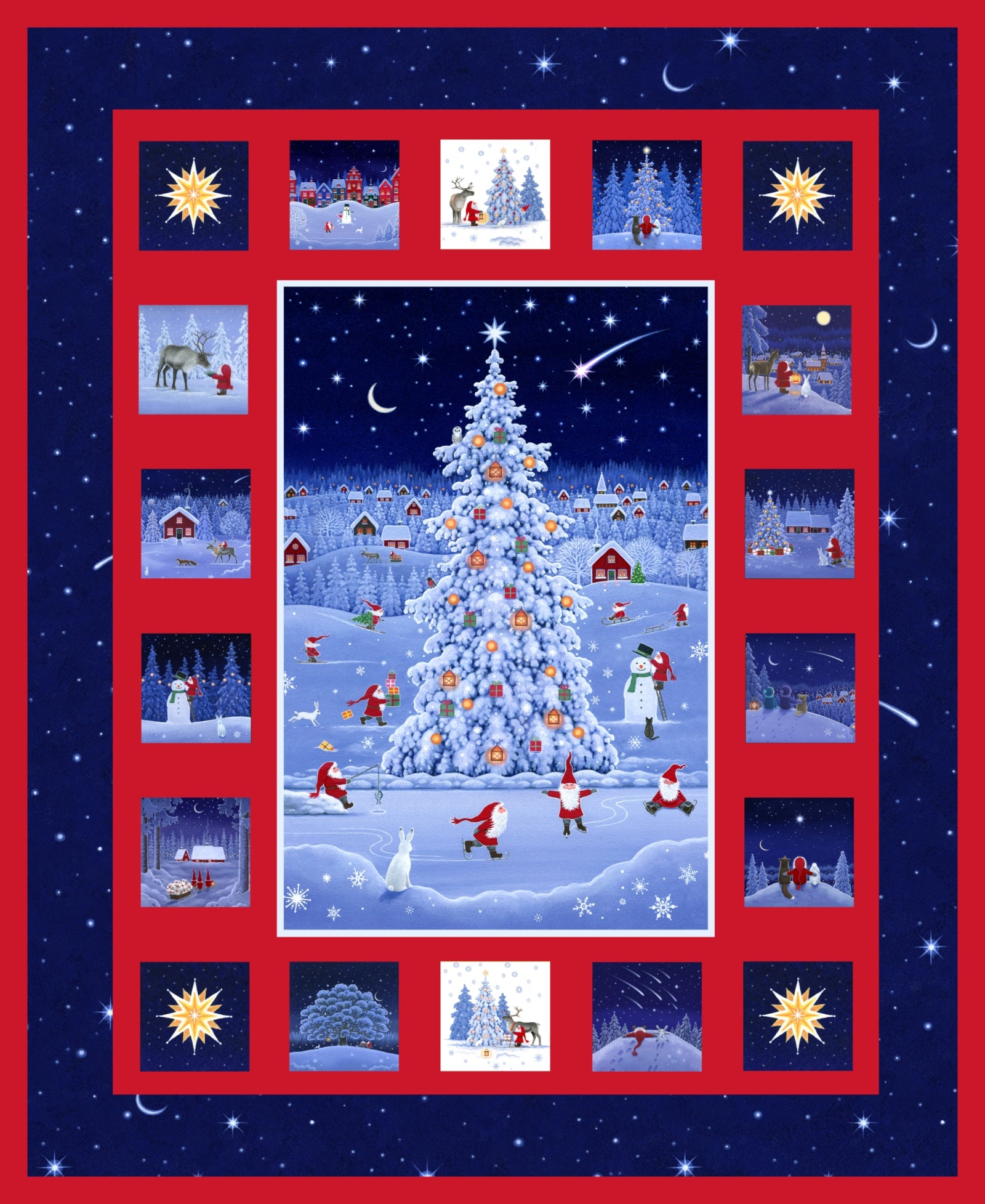 Tomten’s Forest Friends panel features a large image of a Christmas tree in the center of the panel.  The tree is bordered by 18 individual boxes; these boxes feature Tomten and his forest friends, with star blocks at the four corners.  An additional border matching the moon and stars allover print surrounds the box border and the panel is finished with an outside border of red.