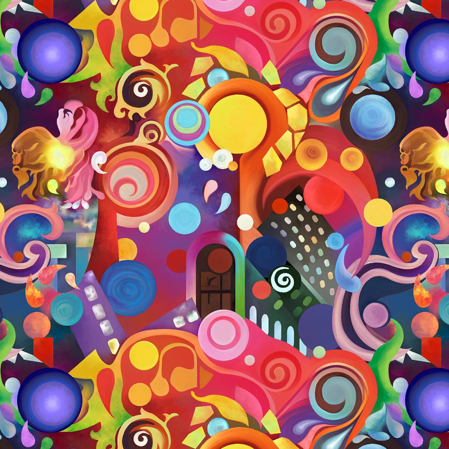 This fabric features an explosion of colored abstract shapes and swirls in shades of orange, pink, yellow, blue, and green. The design showcases circles, spirals, and various organic forms. The pattern repeats every 7 inches.