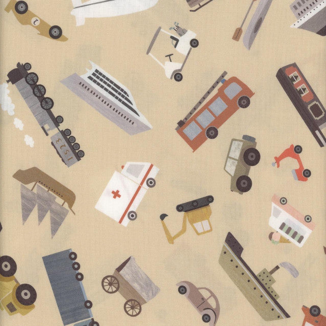This fabric showcases an array of transportation-themed illustrations, featuring planes, trains, and automobiles, scattered across a soft beige background.