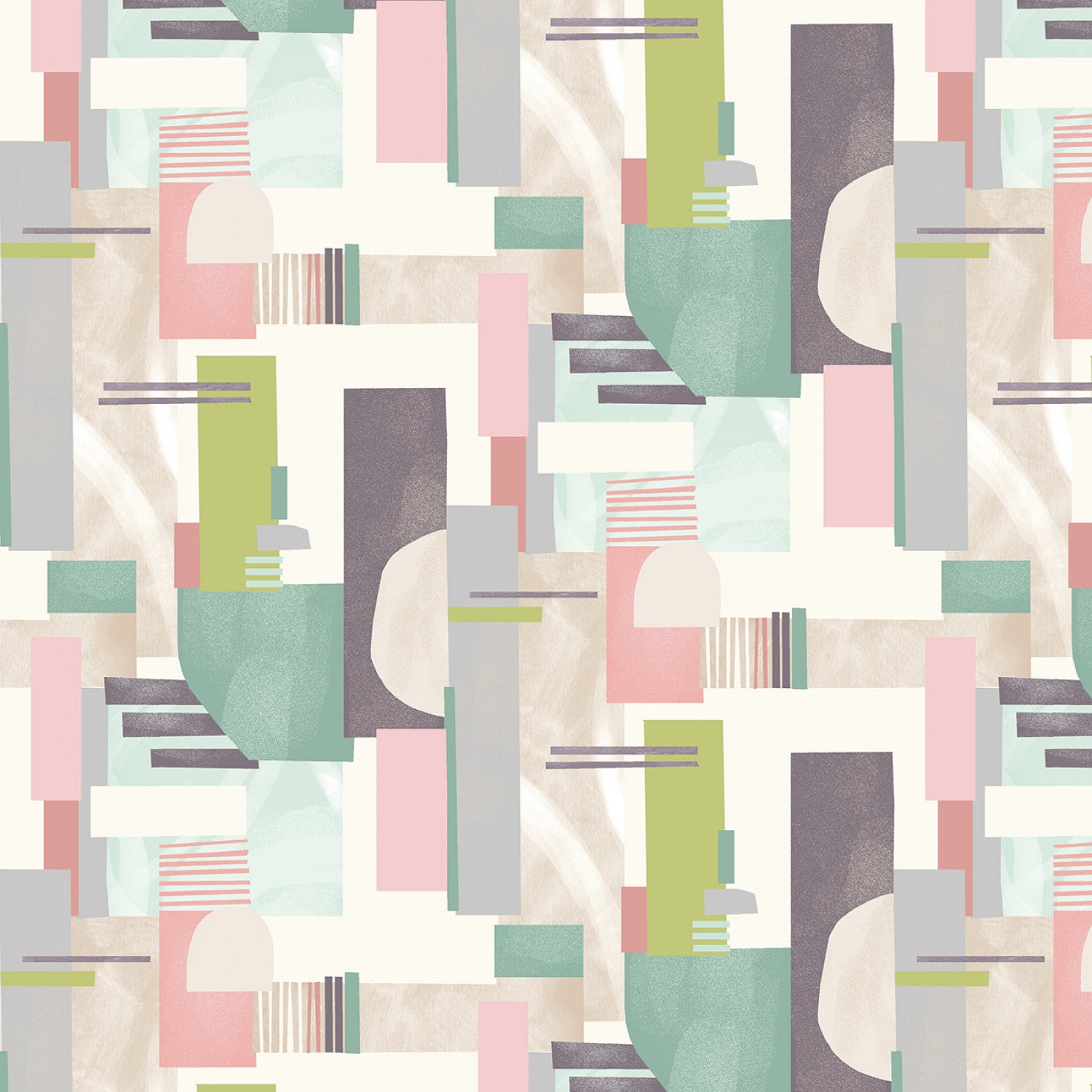 This fabric features a modern abstract design with an 8-inch repeat pattern. The design showcases a mix of geometric shapes in various pastel and muted tones, including shades of pink, green, gray, and beige.  The pattern is composed of overlapping rectangles, circles, and lines.