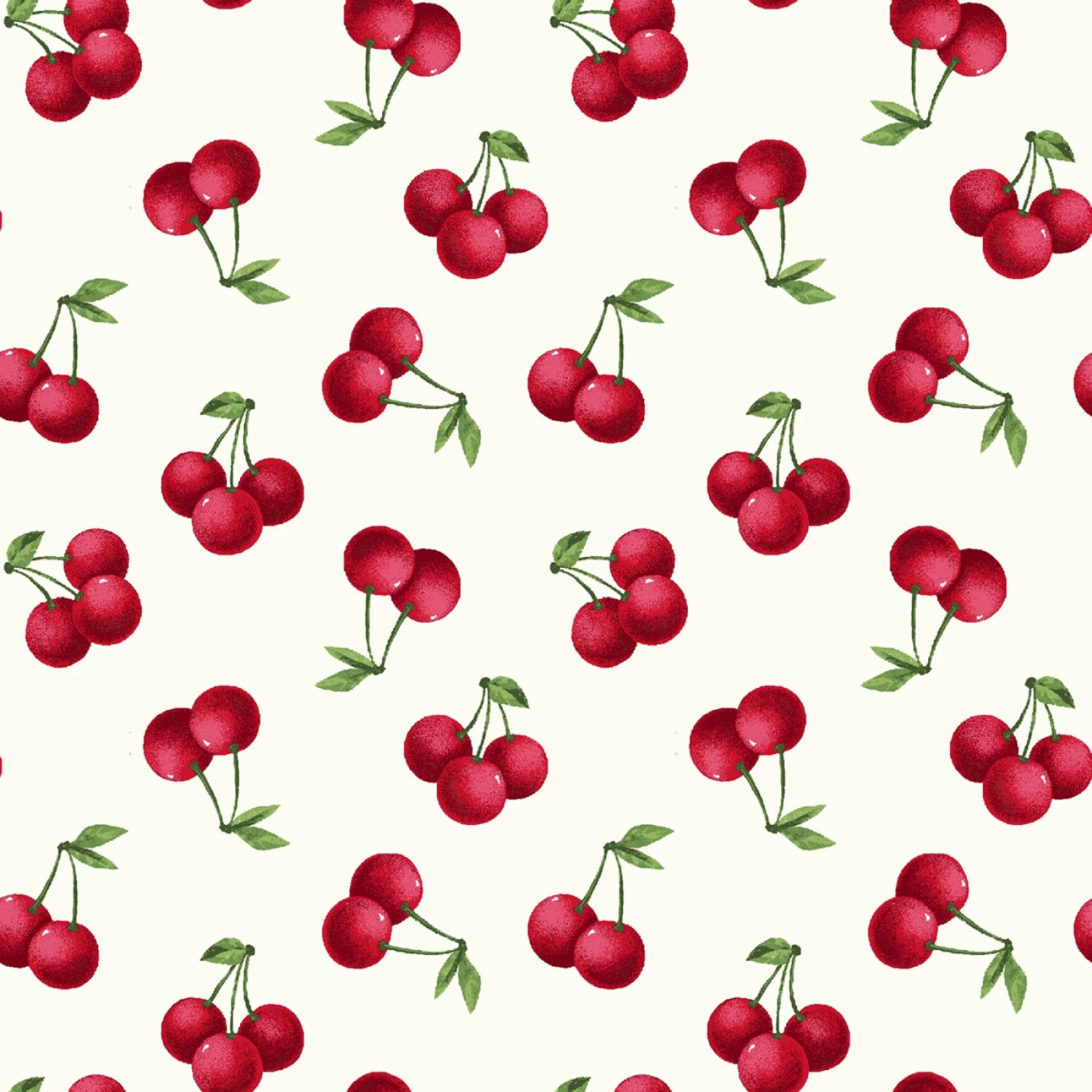 This fabric features a pattern of red tossed cherries. The cherries are scattered across a clean white background with a 3-inch repeat.