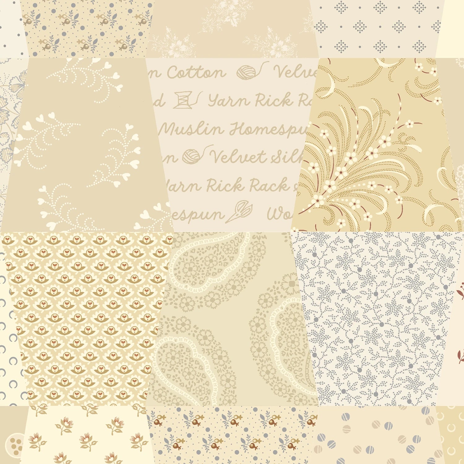 This fabric features a patchwork design in soft cream tones, blending various patterns such as floral motifs, paisleys, and geometric prints. The intricate design includes text elements like "Cotton Velveteen" and "Muslin Homespun," .