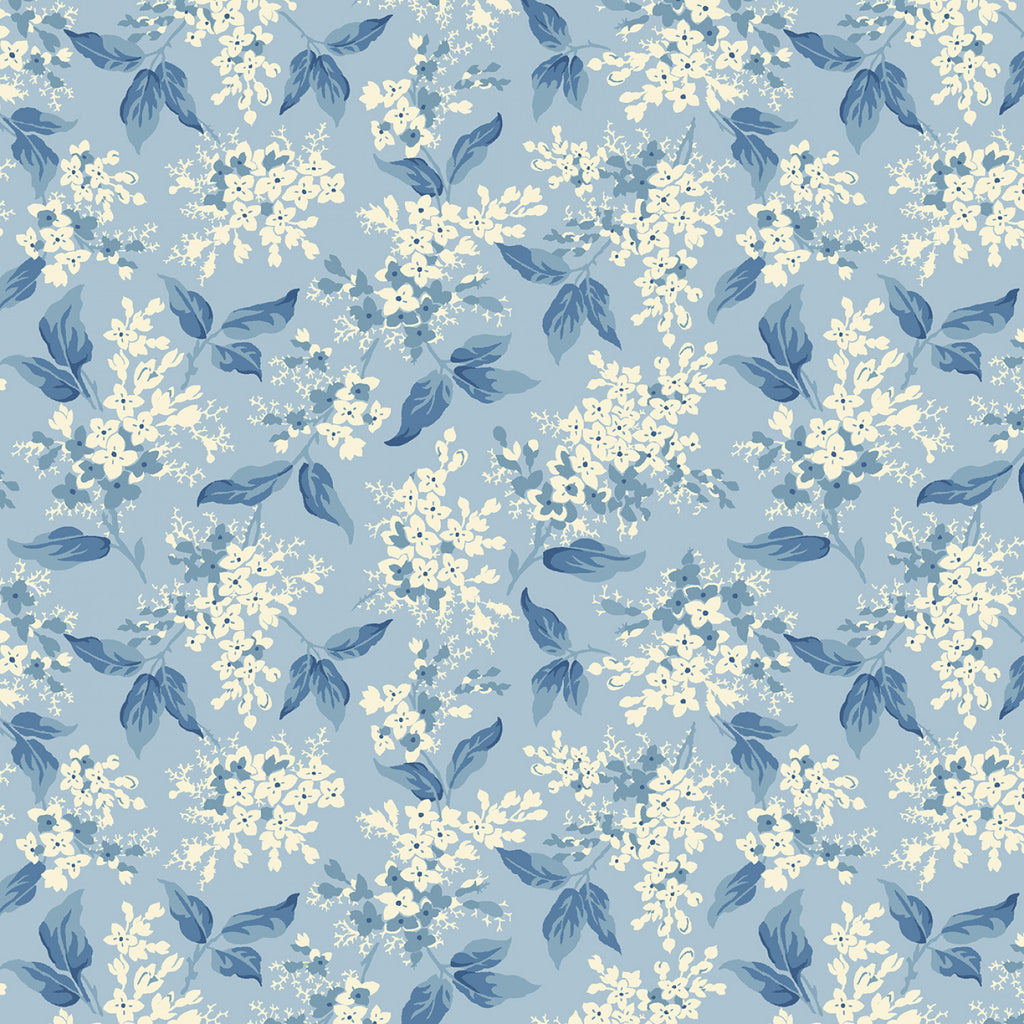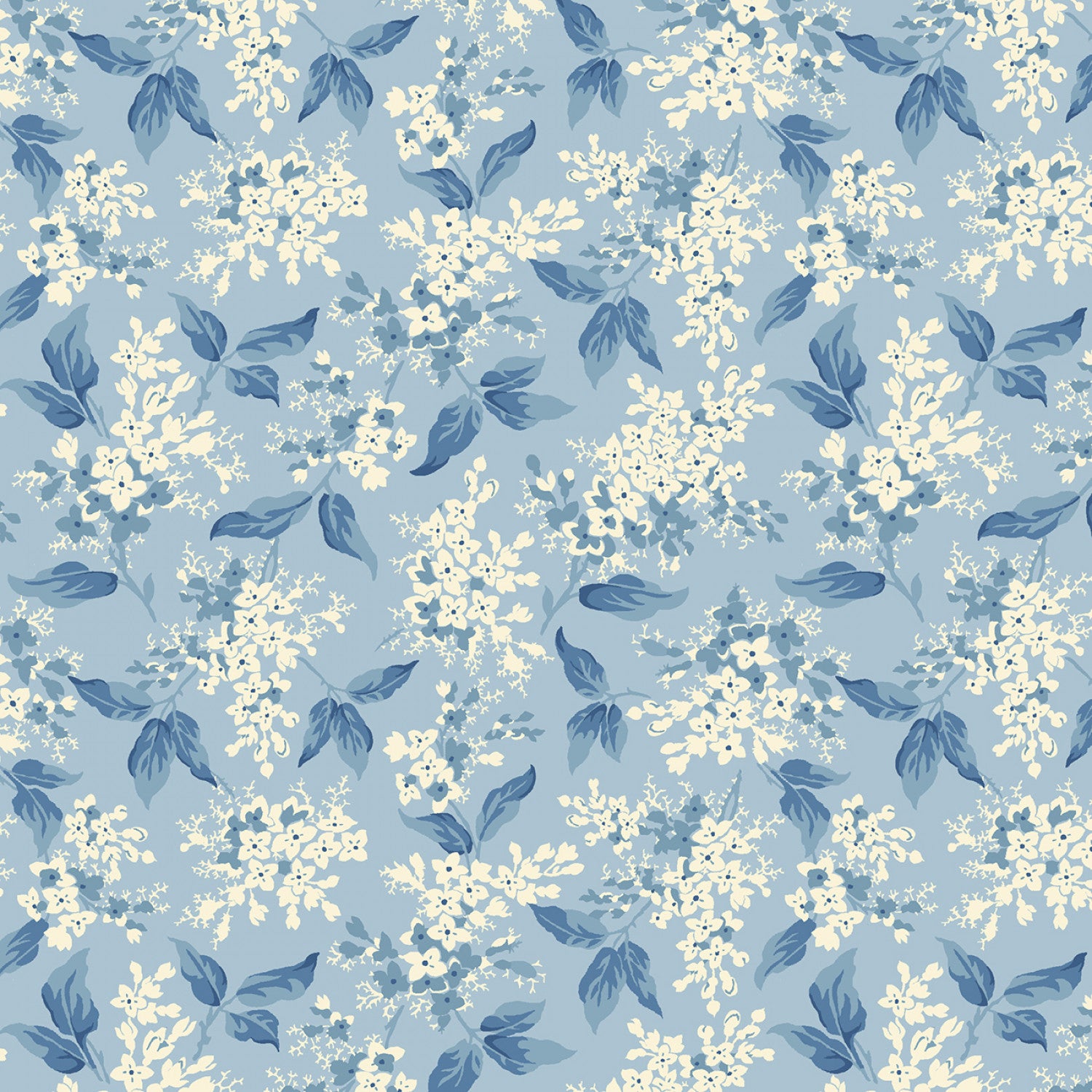 This fabric features a delicate floral pattern of lilac blossoms and leaves in soft shades of blue and cream, set against a light blue background.