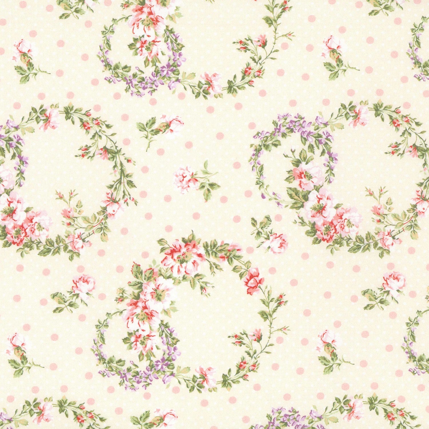 This fabric features a design of intertwining floral wreaths, each composed of a mix of pink and purple roses with green leaves. The wreaths are scattered across a soft cream background, dotted with tiny pink polka dots.