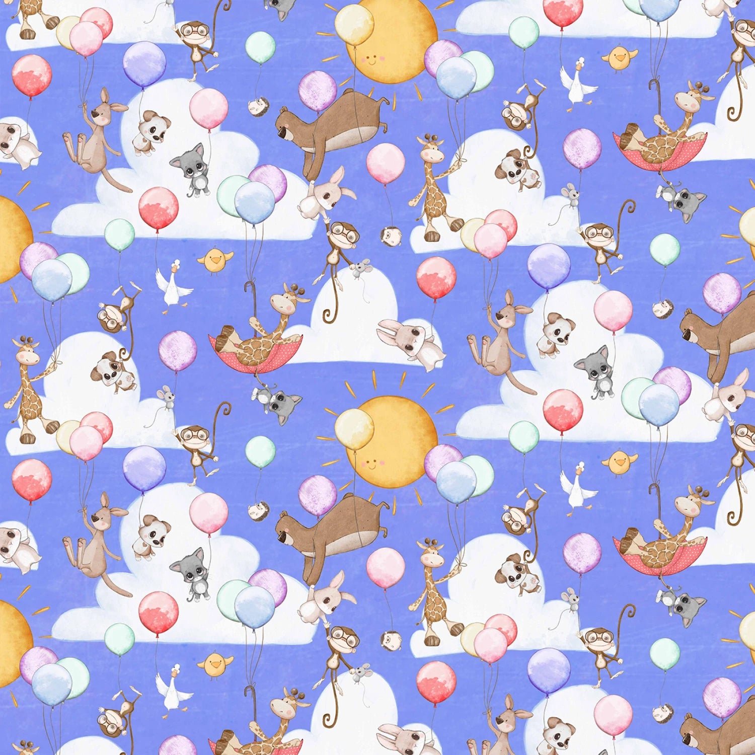 This fabric features a sailor-themed print of playful monkeys, giraffes, and koalas soaring amidst colorful balloons, fluffy clouds, and a cheerful yellow sun against a vibrant blue sky.