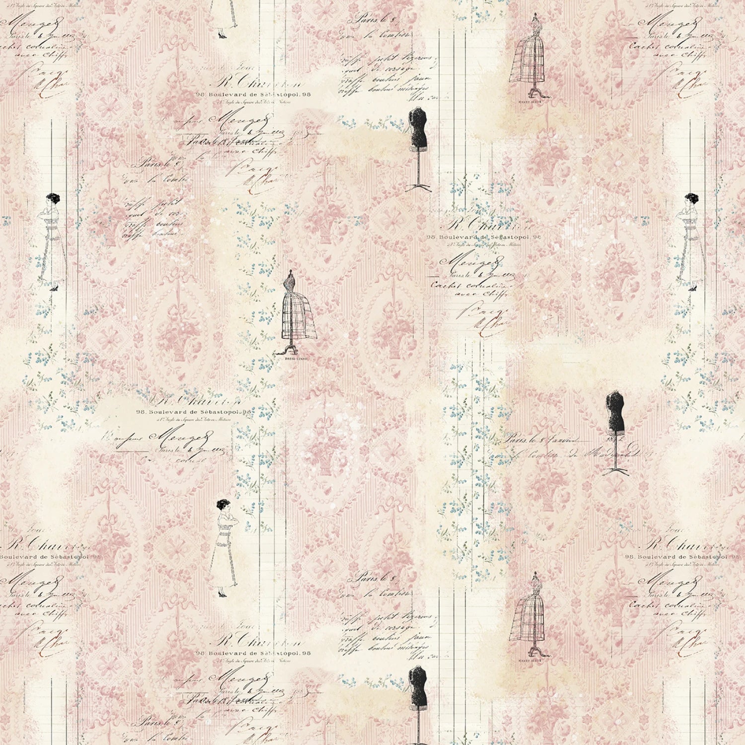 This fabric features a light pink background with a pattern of mannequins and stripes, along with script and floral motifs, all set in a 9-inch repeat. 100% cotton. 44/45" wide.