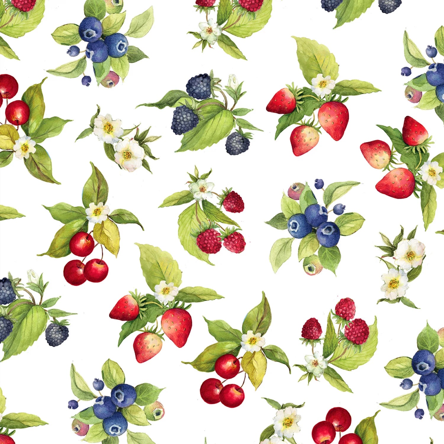 Fabric features tossed clusters of strawberries, raspberries, blueberries, blackberries, and cherries on a white background.
