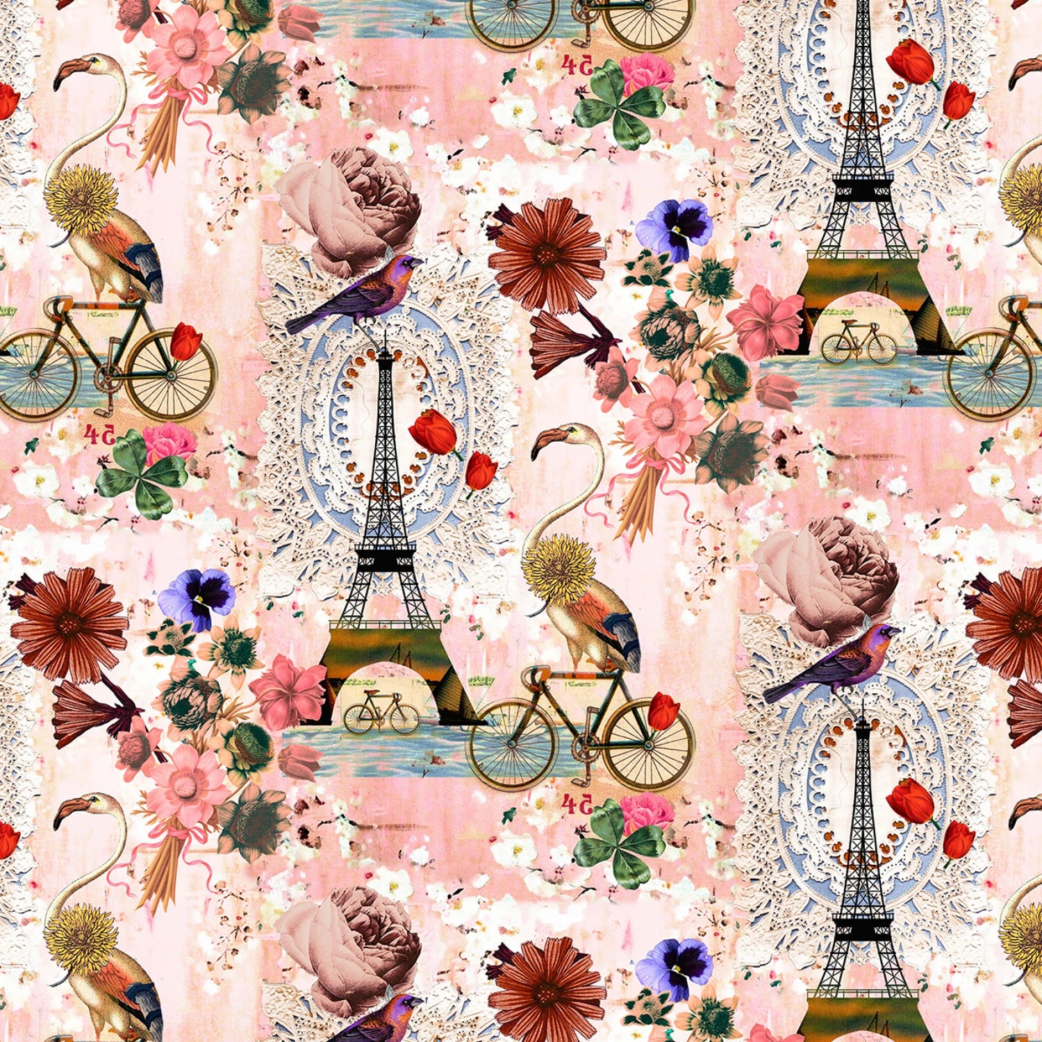 This fabric features a collage of Parisian themes -- iconic landmarks like the Eiffel Tower and Ferris wheel, alongside charming bicycles and vibrant birds. The design is set against a soft ballet pink background.