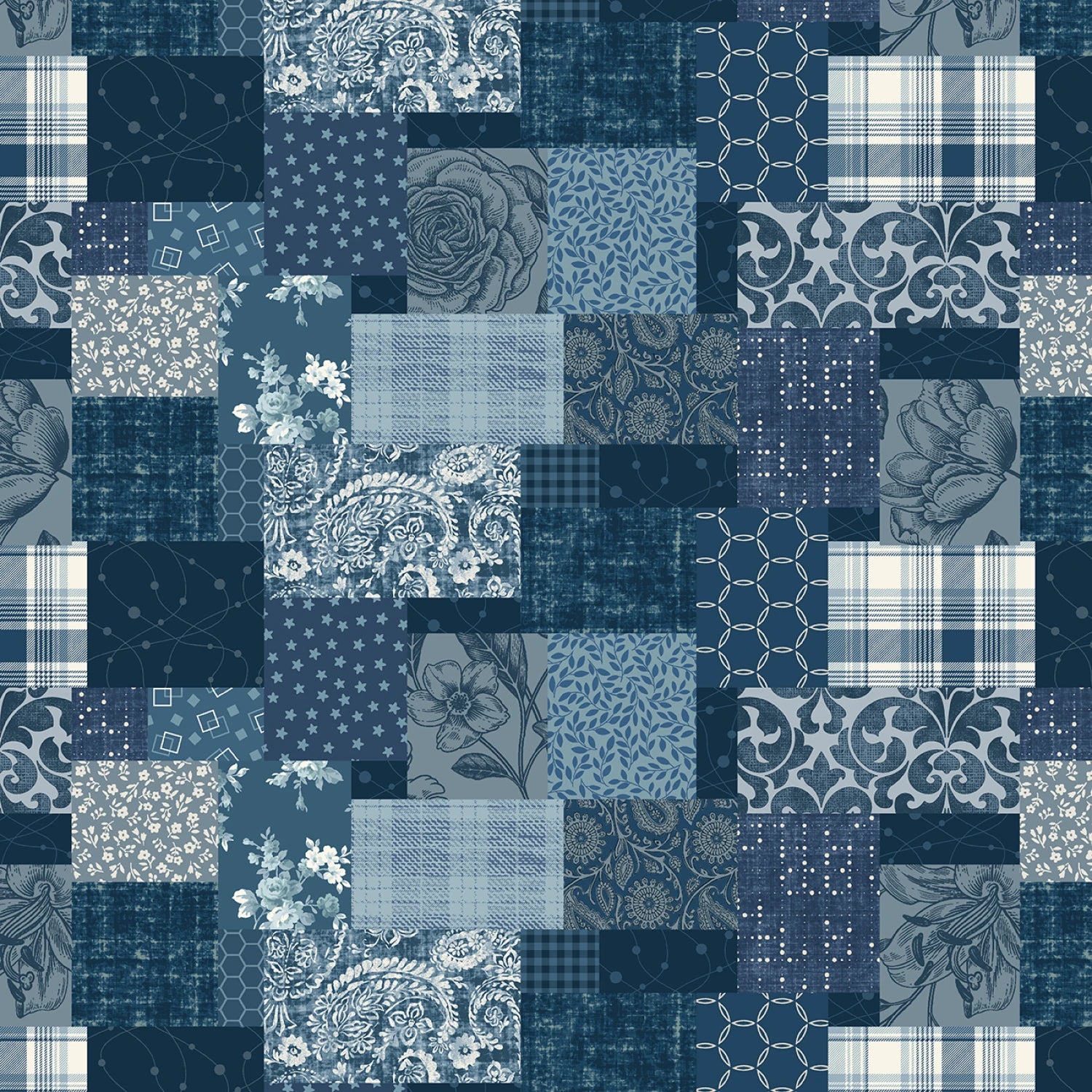 This fabric features a patchwork design with a 16-inch repeat, showcasing a blend of various patterns in shades of blue. The design includes elements like plaids, floral motifs, paisleys, and geometric patterns.