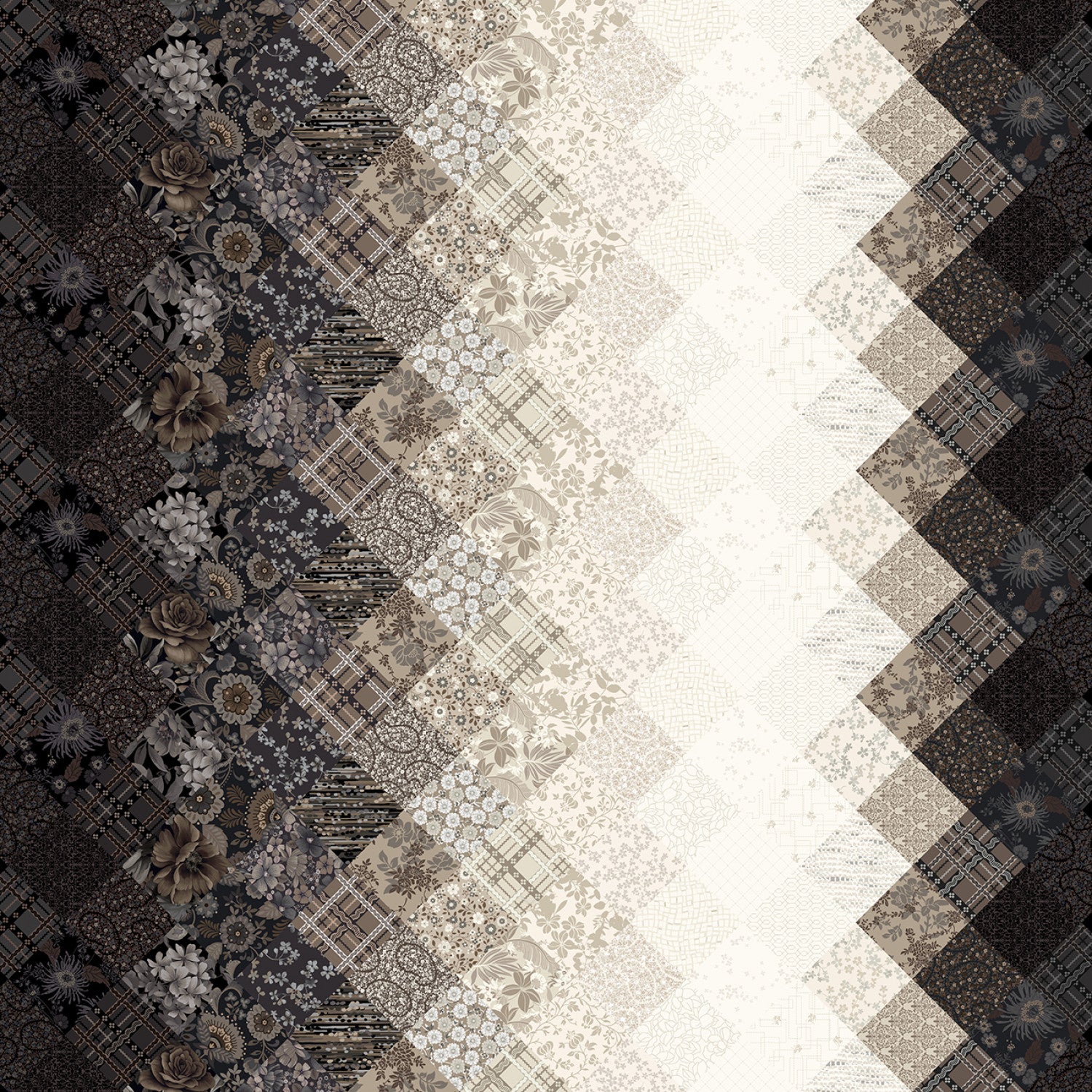 This fabric features a gradient design that transitions from deep, rich dark tones to lighter shades.  The pattern consists of a series of diamond shapes, each filled with intricate floral and plaid motifs, providing a cheater quilt look. Eighteen inch repeat.