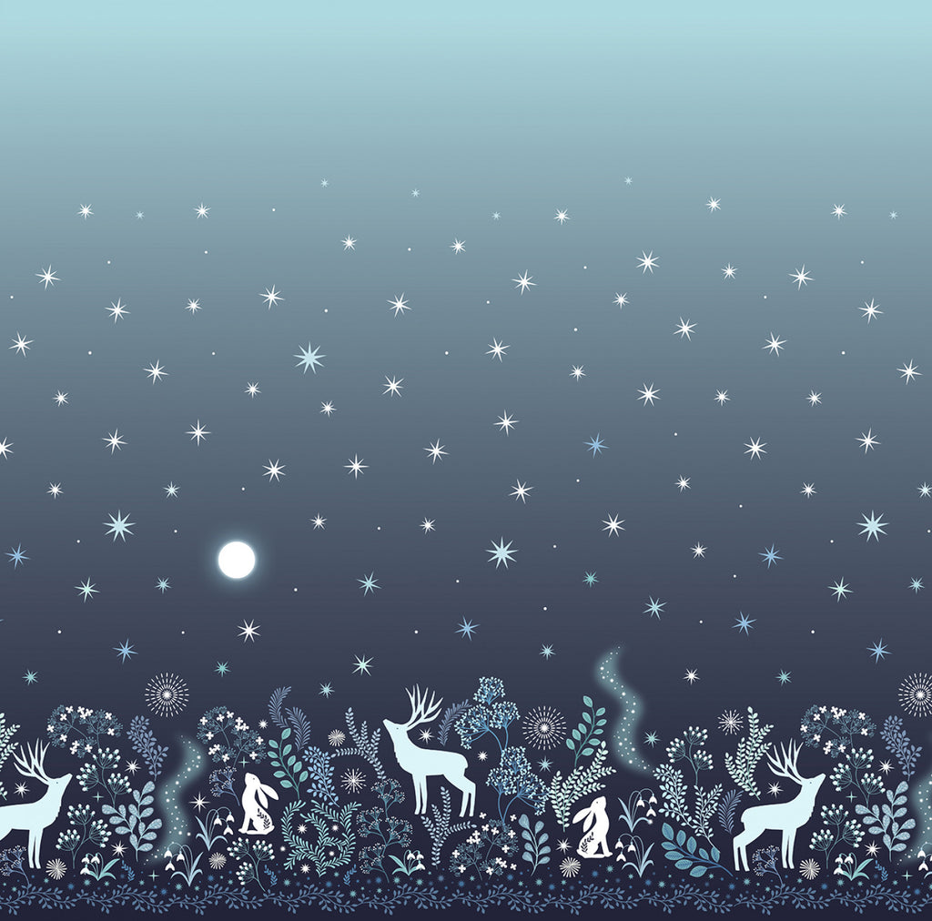 This fabric features frosted foliage, twinkling stars and delicate pearl snowdrops while hares and stags glow in the moonlight on an blue background. Fabric design is enhanced with pearlescent accents.