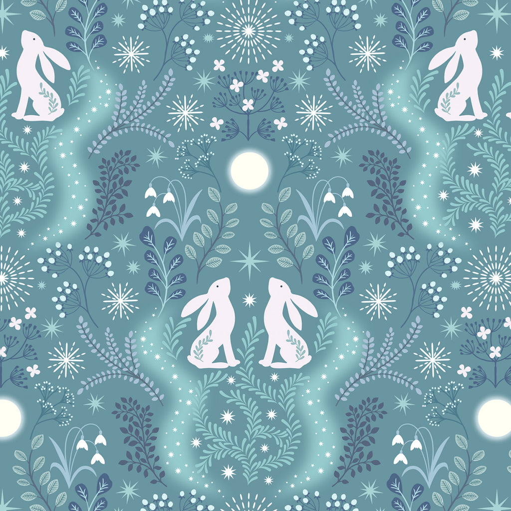 This fabric features frosted foliage, twinkling stars and delicate pearl snowdrops while hares glow in the moonlight on an aqua background. Fabric design is enhanced with pearlescent accents.