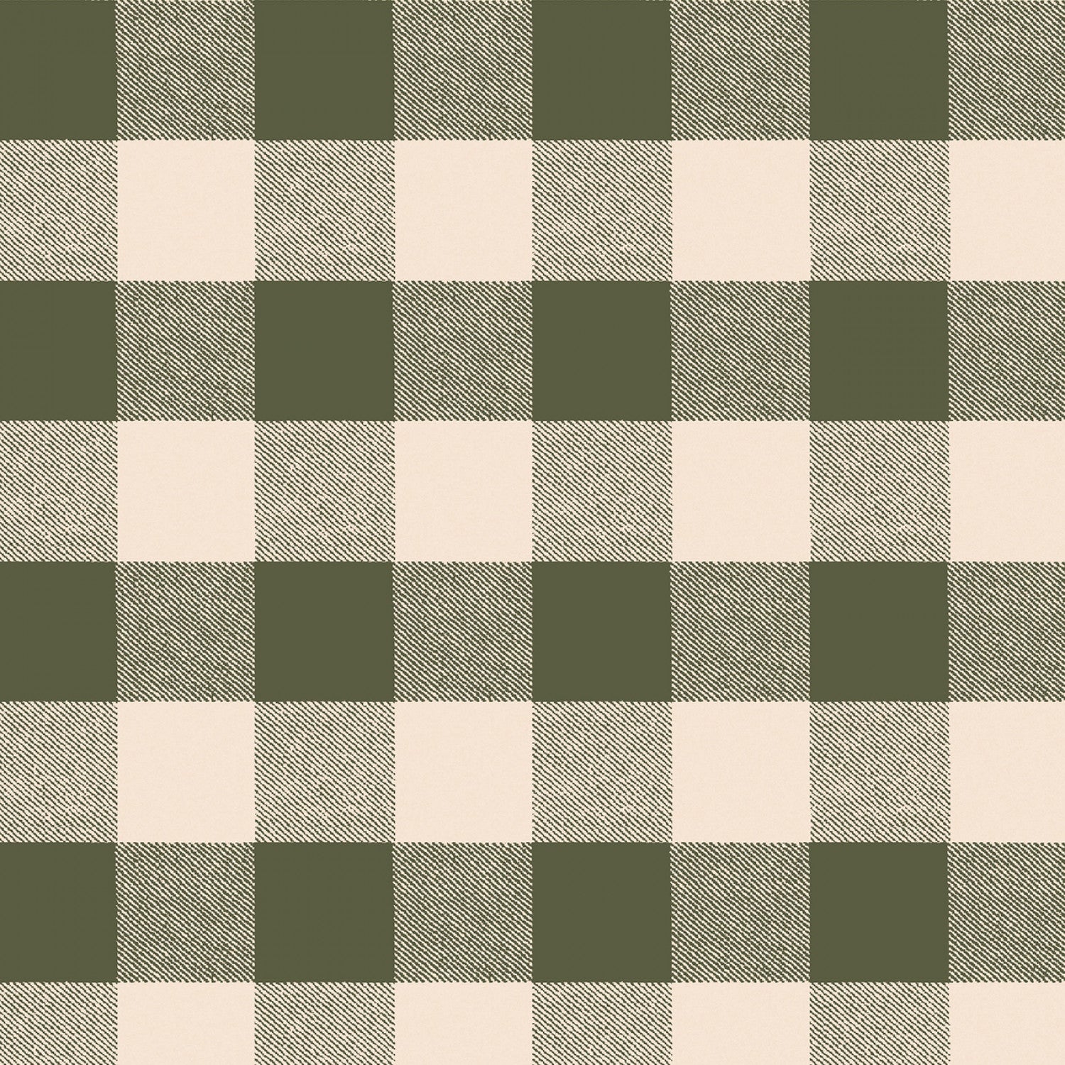 This flannel fabric features a classic plaid pattern with a cozy, rustic charm. The design showcases a harmonious blend of dark green, light green, and cream squares, arranged in a traditional checkered pattern.