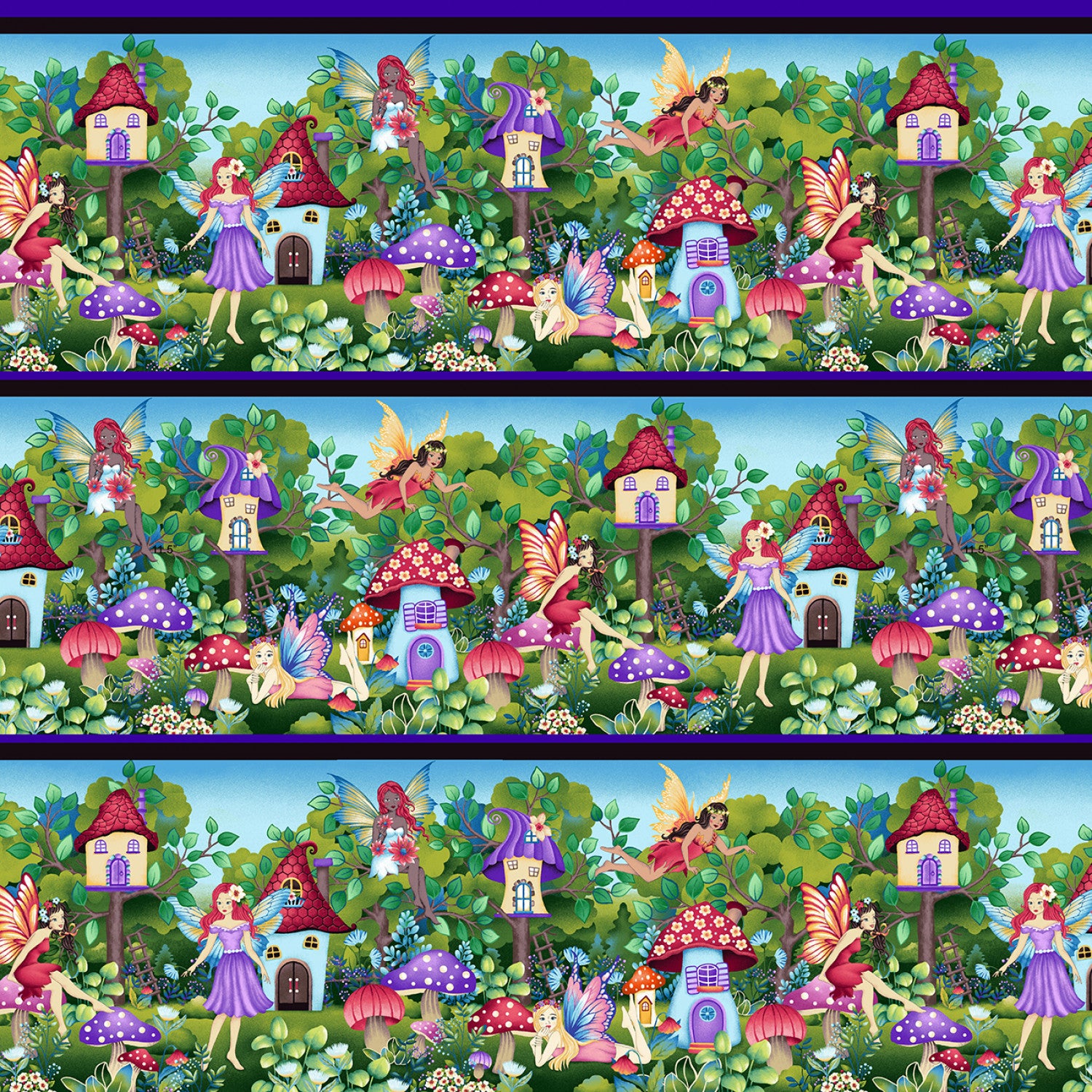 This border stripe fabric features a whimsical forest scene filled with fairies, vibrant flowers, and colorful mushrooms. The design showcases a large border stripe with a 24-inch by 44-inch repeat, creating a magical woodland atmosphere. The fairies, dressed in elegant purple dresses, flutter around charming houses perched on tree stumps providing a touch of whimsy and magic to the scene.