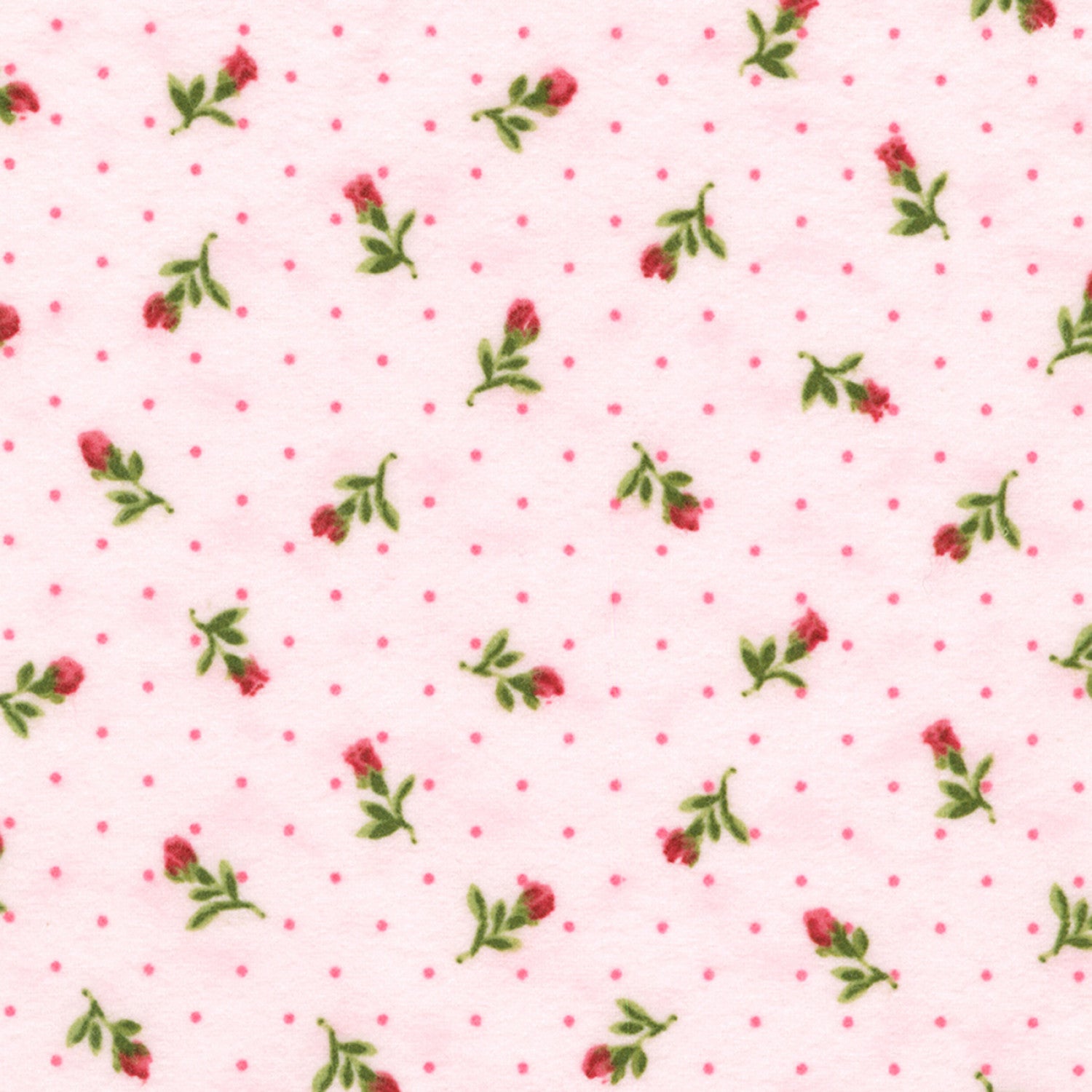 This flannel fabric features a delicate pattern of red roses with green leaves scattered across a soft pink background, dotted with tiny pink polka dots.