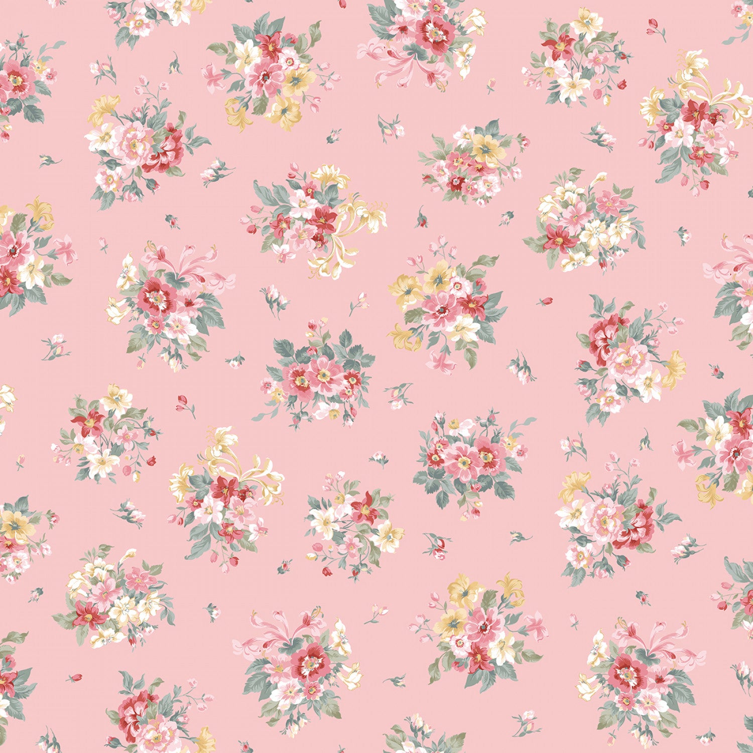 This flannel fabric features a delicate pattern of floral bouquets scattered across a soft pink background. Each bouquet consists of a delightful mix of flowers in shades of red, pink, yellow, and white, surrounded by lush green leaves.