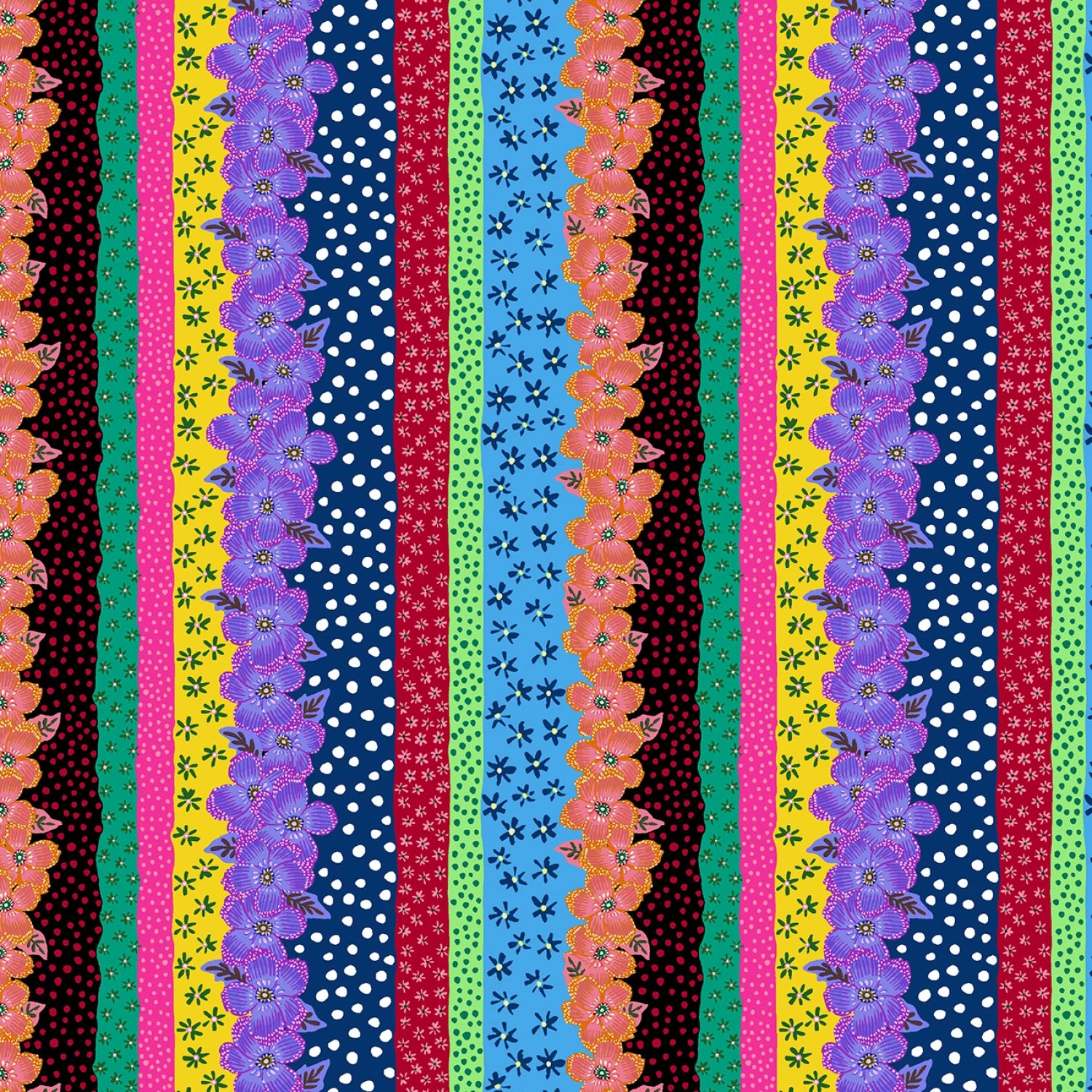 Fabric features a lively stripe pattern with vertical stripes in various bright colors including green, pink, yellow, and blue, each adorned with different floral motifs. The flowers range from small scattered blooms to larger, more detailed clusters.