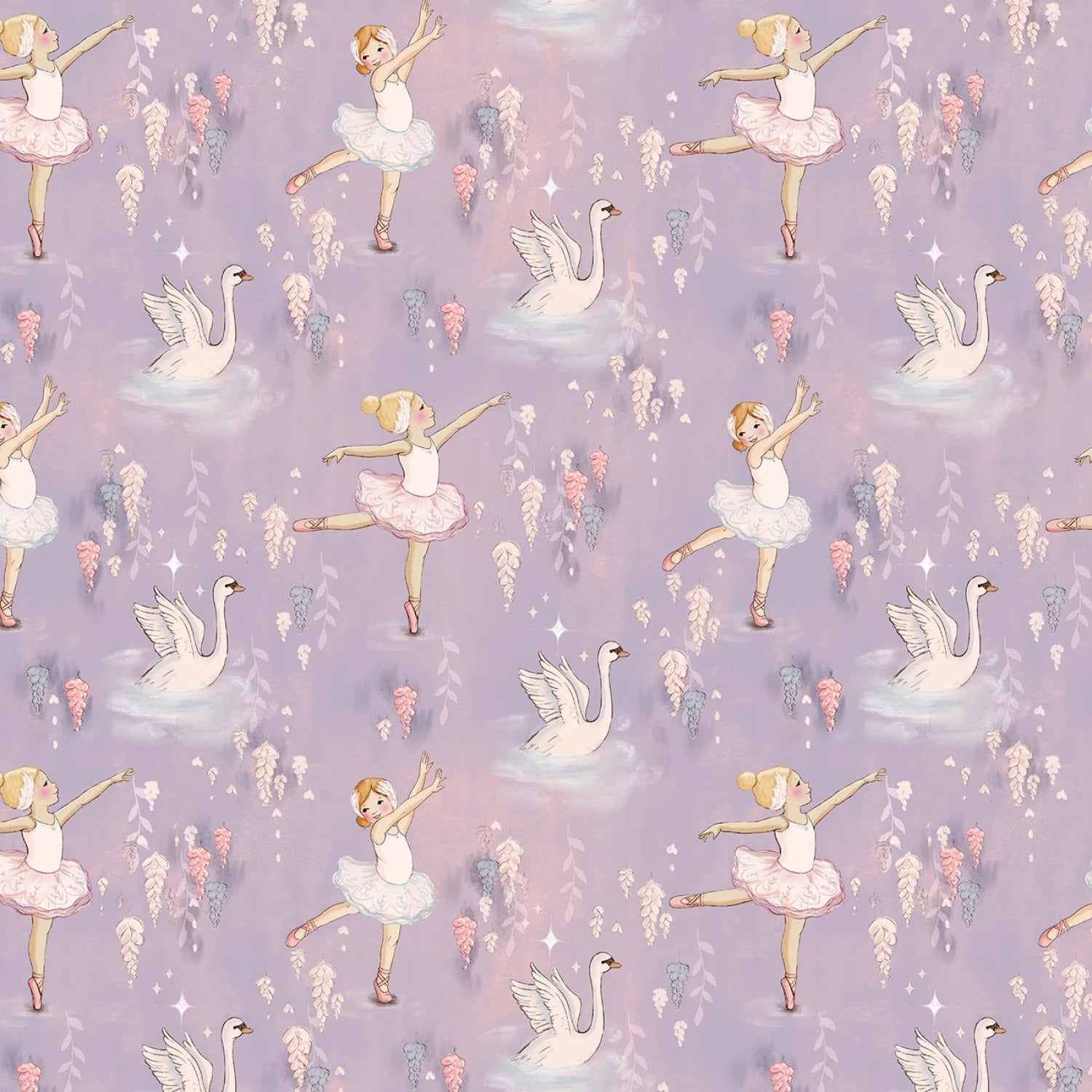 This fabric features a ballet theme with ballerinas in graceful poses, accompanied by elegant swans, all set against a soft lavender background. The design is adorned with subtle floral accents and tiny stars as background elements.