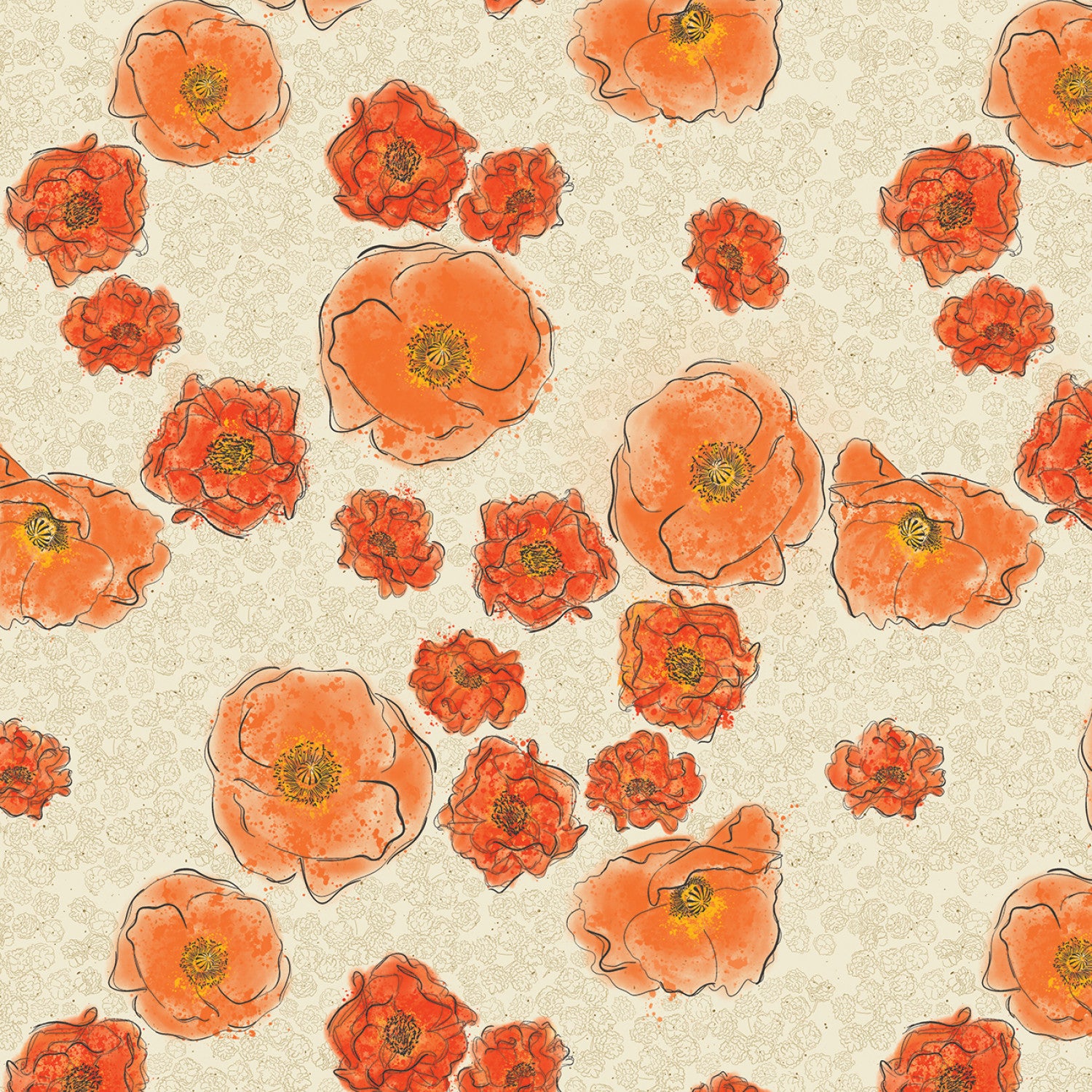 This fabric features a design of vibrant orange poppies scattered across a subtle, textured background. The poppies are illustrated with a watercolor effect, giving them a soft, artistic appearance.