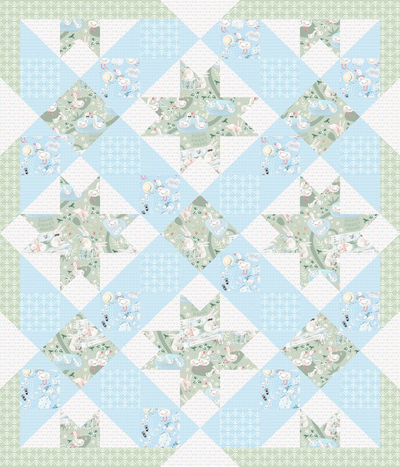 This fabric features a cheater quilt print design with a central theme of geese and floral motifs. The pattern is composed of alternating blue and green squares, with some squares showcasing a soft, dotted texture and others displaying intricate floral and goose illustrations. The quilt layout includes star-shaped blocks.