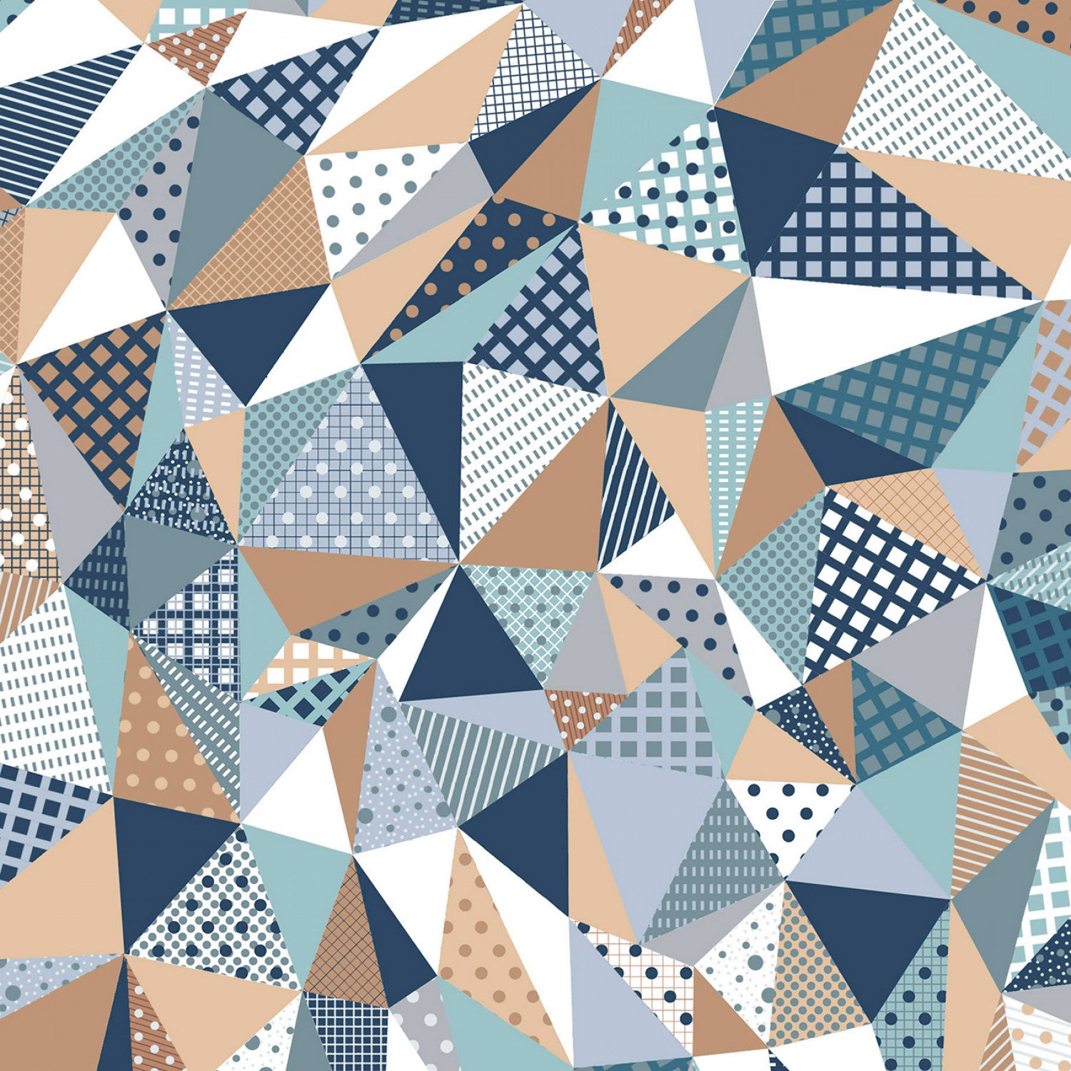 This fabric features a geometric pattern composed of various triangular shapes, each filled with different patterns such as polka dots, checks, and stripes. The color palette includes shades of blue, white, tan, and brown, creating a modern and eye-catching design.