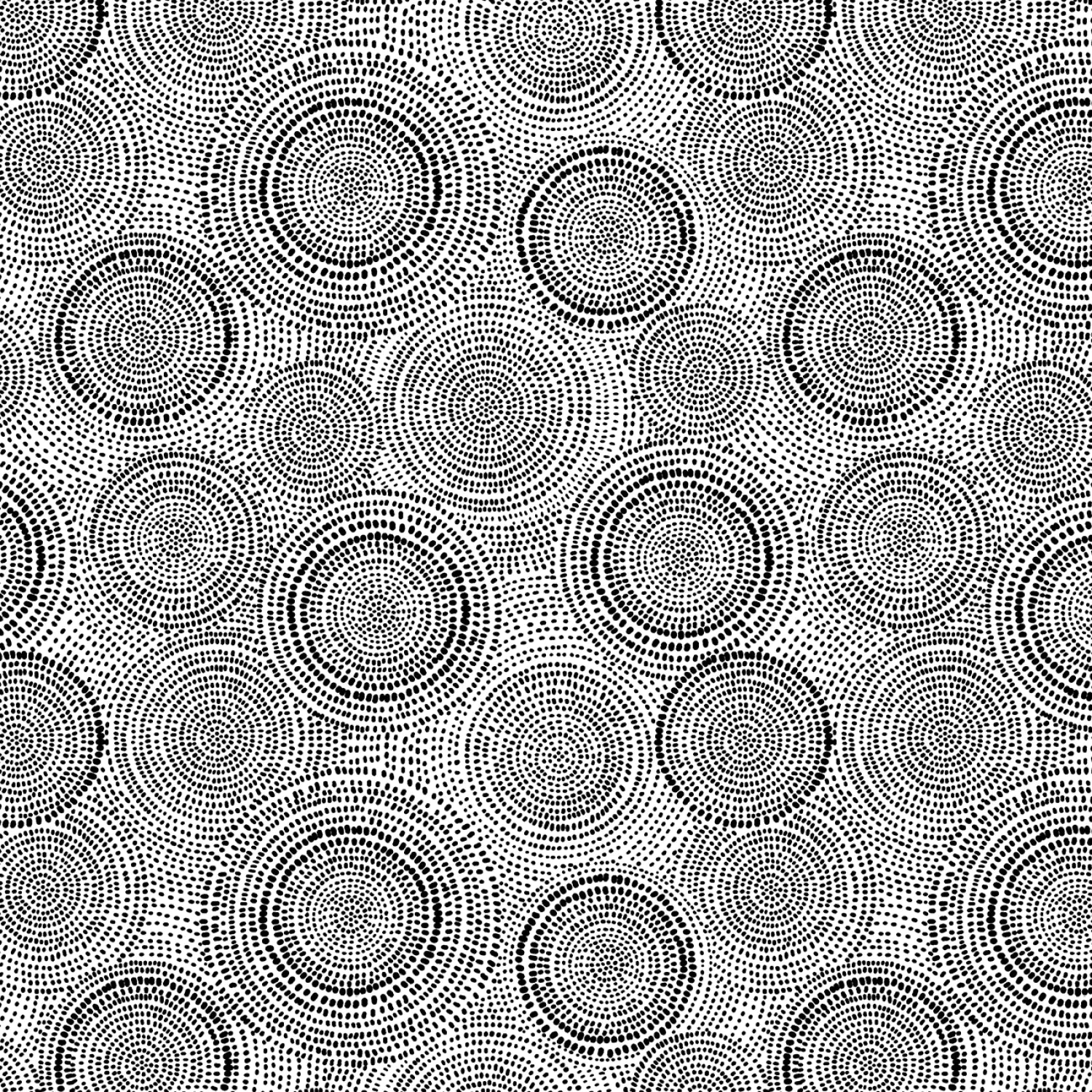 This fabric features a design of black circular patterns on a cream background, creating a mesmerizing effect with varying sizes of concentric circles.