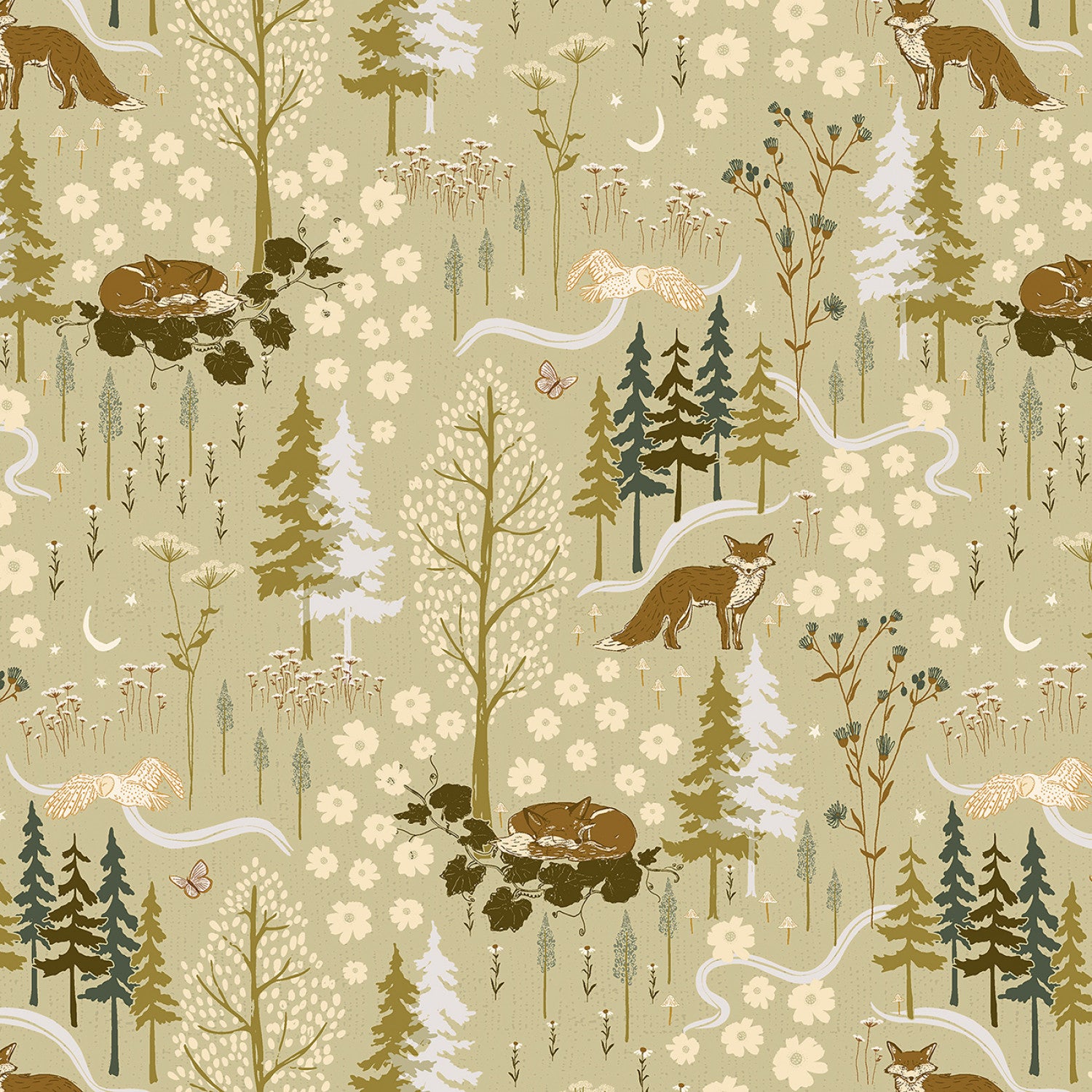 This fabric features a forest scene with foxes, trees, and wildflowers set against a soft sage green background. The design captures the tranquility of nature with detailed illustrations of foxes in various poses, tall pine trees, and delicate wildflowers.