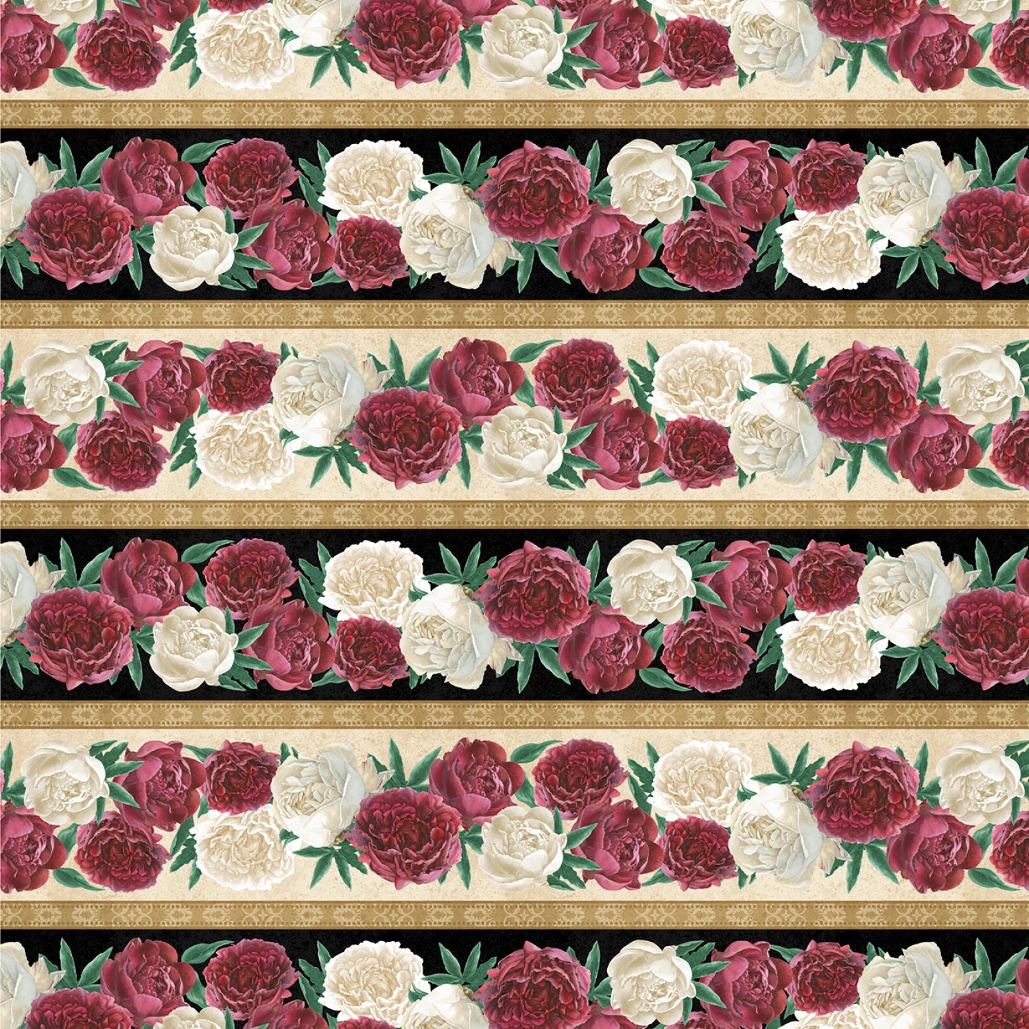 This fabric showcases a design with a multi-repeating stripe pattern. The stripes are adorned with vibrant red and delicate white floral motifs, set against a soft cream background, bordered by rich black and gold accents.