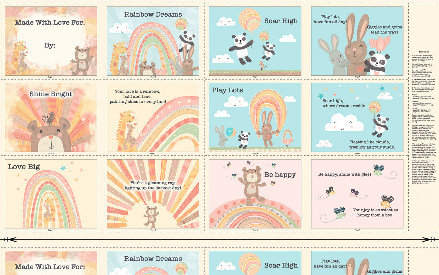 This book fabric panel features pages filled with illustrations of animals and rainbows. The design includes phrases like "Rainbow Dreams," "Shine Bright," "Play Lots," "Soar High," and "Be Happy," accompanied by cute animals like pandas, bunnies, and bears, set against soft pastel backgrounds.