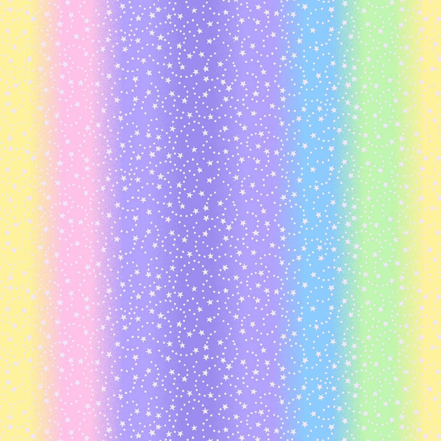 This fabric showcases a gradient design that transitions through a spectrum of yellow, pink, purple, blue, and green, dotted with tiny white stars for a rainbow effect.